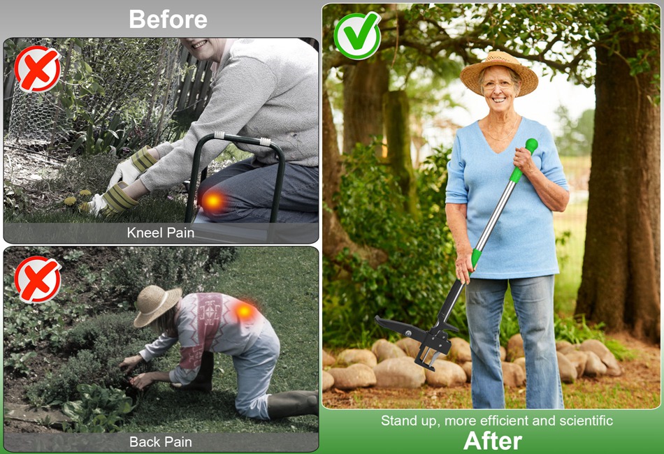 - Stand up Weed Puller:Our weed puller with long rod helps you get rid of bending knees and back pain,allows you to stand up to remove those pesky and reoccurring weeds. Without using harsh chemicals to harm you soil,provide you an efficient,scientific and safe method to achieve beautiful garden.