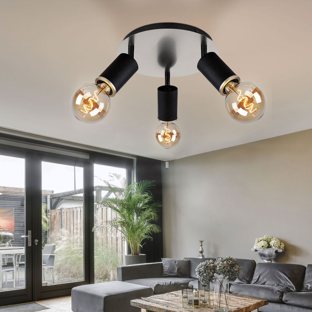 Er besteht aus einer runden, nickel-matten Metallplatte, an der drei von schwarzem Holz und nickel-mattem Metallring ummantelte E27-Fassungen angeordnet sind.