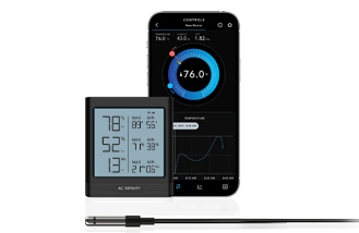 A smart hygrometer designed to provide accurate temperature and humidity readings to help you maintain the ideal environment for your room. This model utilizes our steel thermal-alloy probe to accurately measure climate conditions and generate daily high and low readings of spot locations. Its digital LCD screen can produce a backlight that can display information in darker settings. So whether you are wall hanging, magnet mounting, or desktop placing the temperature sensor, you will be able to quickly inspect your space to react to sudden changes. This product is a part of the UIS™ platform of grow devices and smart controllers, designed to unite with the AC Infinity app over WiFi to achieve your ideal environment.