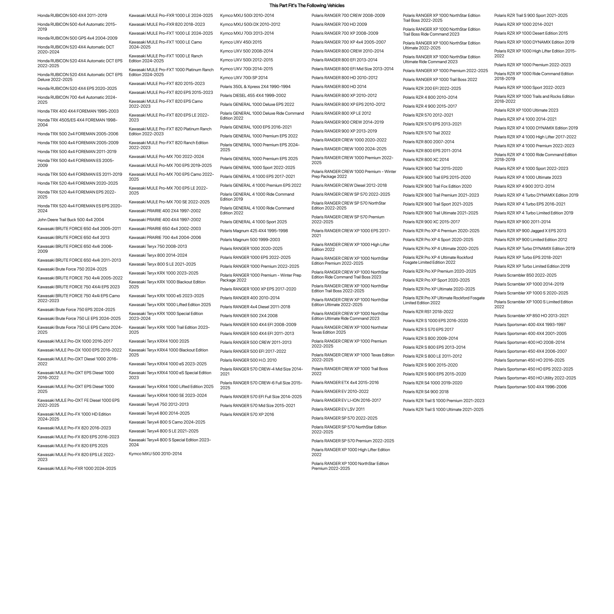 Special Notes:Please note: Tire sizes vary by machine please check your current tire and wheel size before ordering.Adding oversize tires may alter the handling characteristics of your factory equipped vehicle. Extreme care must be used to prevent loss of control or roll over during sharp turns or abrupt maneuvers. Oversize tires may rub under extreme steering angles, and extreme suspension compression.
