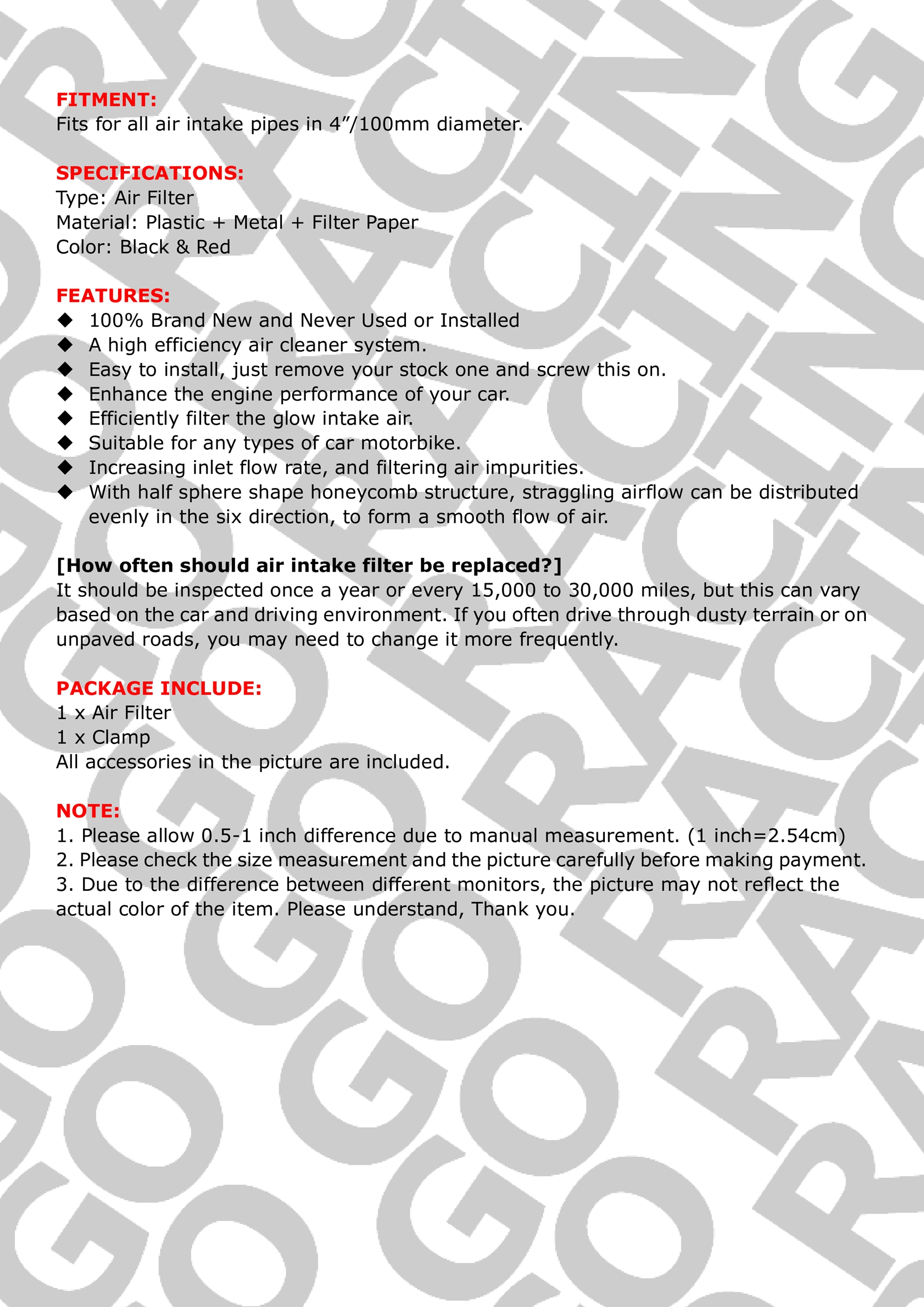 Red 4" Inlet Truck Air Filter Dry High Flow Clamp-On Round Cone Air Intake Kit