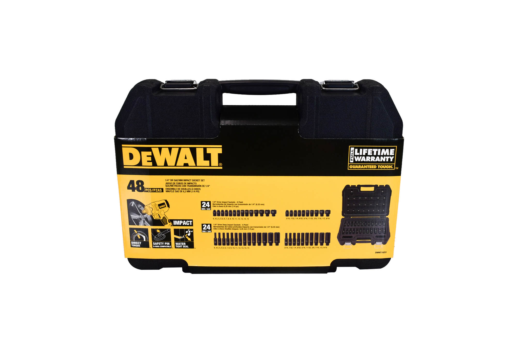 DeWalt DWMT19251 1/4" Drive Impact Sockets are designed with 1/4" drive, heat treated CR-440 steel, high visibility laser etched markings and black oxide coating. Sockets are o-ring and retaining pin compatible. Made to be used with impact tools. Set comes with 24 1/4" drive metric impact sockets and 24 1/4" drive SAE deep impact sockets.