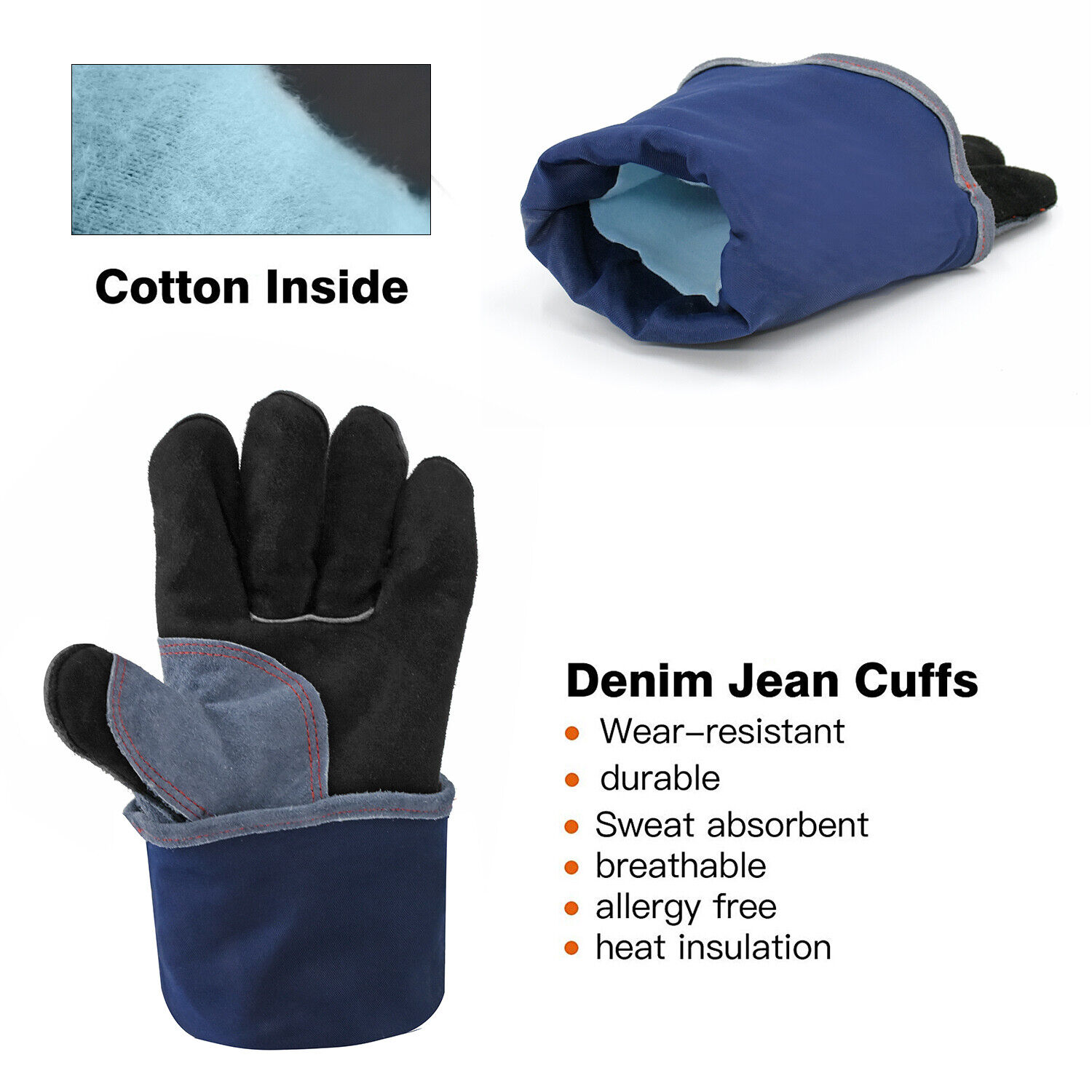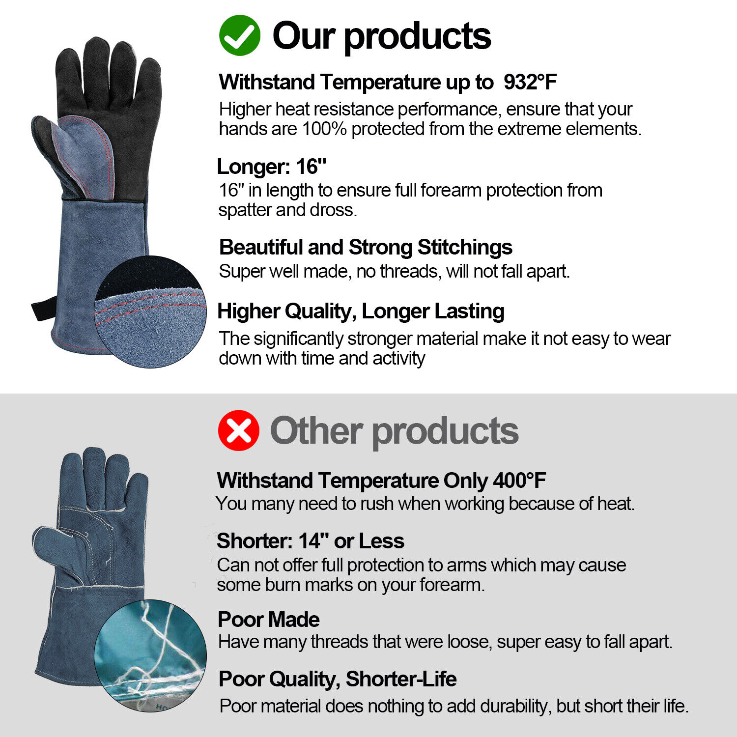 [HIGHER HEAT RESISTANCE PERFORMANCE & FULL PROTECTION] – HITBOX fire gloves are guaranteed to withstand extreme temperatures up to 932°F(500℃). The top quality three layers ( 1. Outer layer: 1.3mm thick cowhide leather, 2. Fire/ heat protection layer: air-isolated aluminum foil, 3. Skin layer: insulated cotton lining), along with welted seams and lining , ensure that your hands are 100% protected from the extreme elements that you work with on a daily basis. [TOP QUALITY COWHIDE MATERIAL] – HITBOX welding gloves are made from top grain cowhide. Cowhide is durable as well as heat and flame resistant for working at high temperatures. It is versatile and is known to provide a balance of durability, dexterity, abrasion resistance, and comfort. Cowhide enables gloves to have better control and movement when working, Excellent performance in heavy duty welding, gripping hot stuff such as stove & cookware & burning coal or firewood. [MUCH LONGER LASTING] – HITBOX gloves are super well made. They have beautiful and stronger stitchings, no loosing threads, will not fall apart like other poor made gloves. To add durability, gloves were reinforced with additional layers of material in high wear or high heat areas, such as the palm, thumb crutch, knuckle, and fingertips. This ensures that your gloves won’t wear down with time and activity. [MULTIPLE USE, IDEAL GIFTS] - The gloves are not only for welding but also useful for many other work and home tasks. Idea for welding, wood stove, barbecue, gardening, animal handling, anti animal biting. Grill, fireplace, oven, and so on. They are ONE SIZE IFTS MOST. Both for men and women to work at kitchen, garden, backyard or outside [CHOOSE US WITH CONFIDENCE] - We offer a 100% satisfaction guarantee. If the gloves are defective or damaged within 90 days,we will replace it for you or provide a full refund. Simply register your product when you receive it and let us know if you ever experience an issue. If there is any issue or advice for our products, please email us directly, we will offer 100% satisfactory service for you.… Even if it is years from now