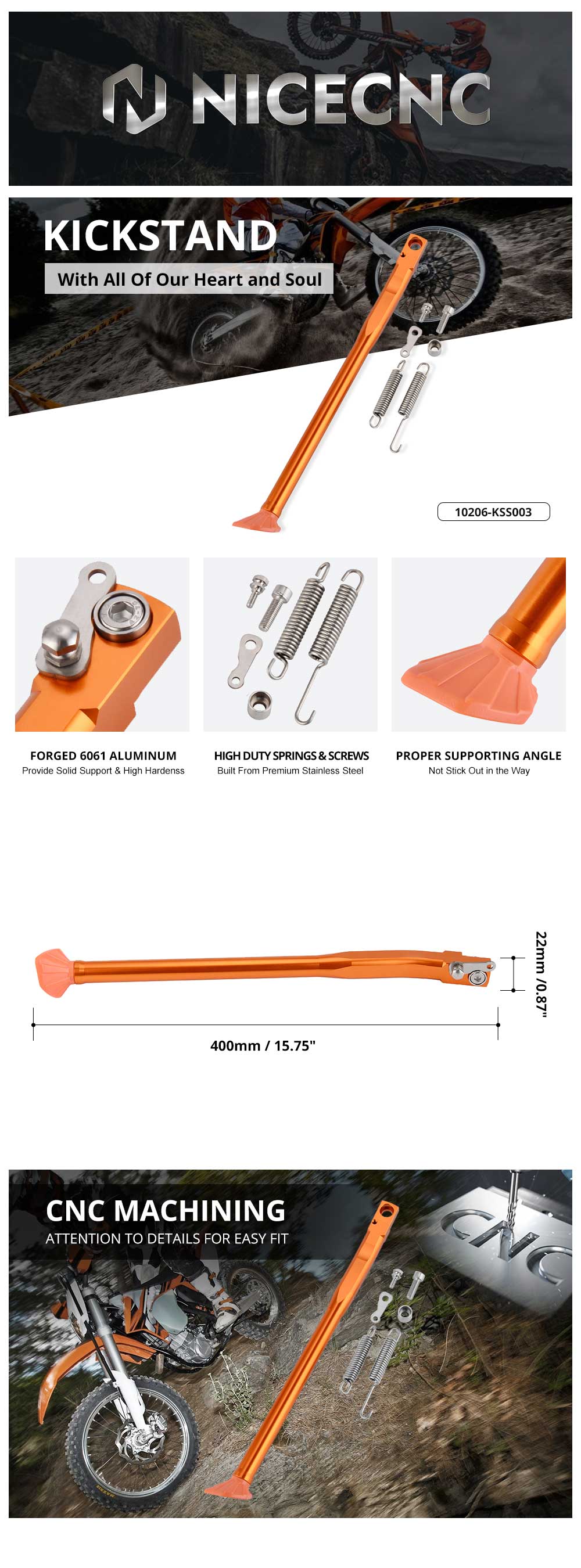 Au fil du temps, la béquille latérale d'origine s'userait et la douille s'étirerait, ce qui ferait tomber la KTM / Husqvarna avec seulement de légères rafales de vent. Vous pouvez démolir et souder sur la béquille latérale pour n'apporter qu'un succès à court terme. Et il y a un meilleur choix pour acheter cet article à remplacer, qui est très facile à installer immédiatement et pas besoin d'acheter des pièces supplémentaires.