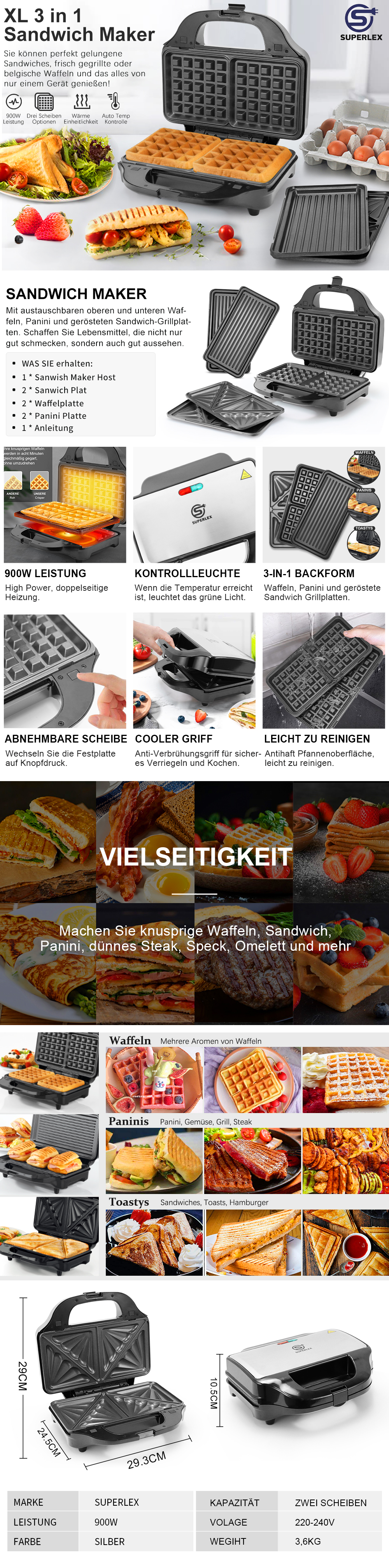【900 W Leistung】 Die Backplatte passt sich nahezu jeder Lebensmitteldicke an. Doppelte Pfanne für gleichmäßiges Braten, sodass Sie 4 Sandwiches gleichzeitig grillen können.