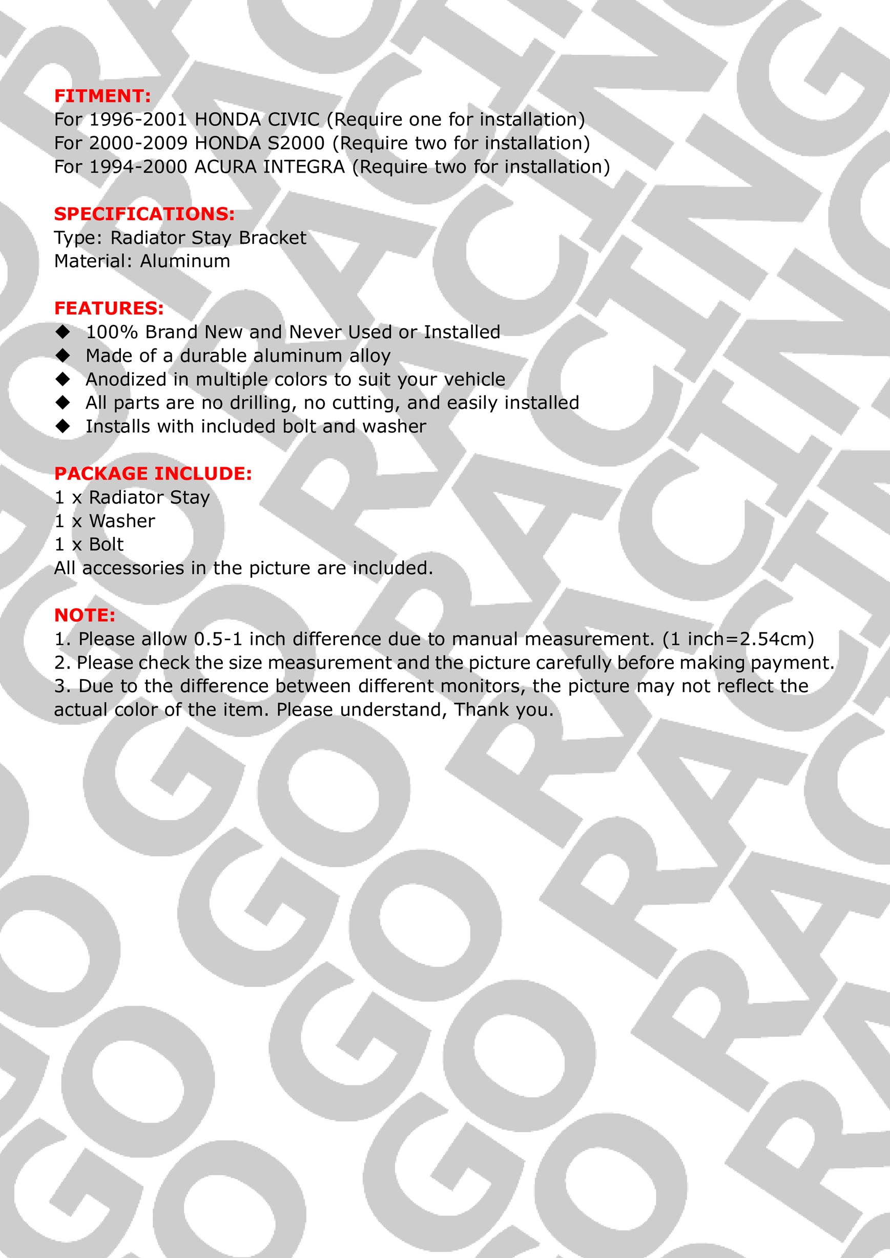 Red Aluminum Radiator Stay Mount Bracket Fit for Honda Civic EK S2000 Acura