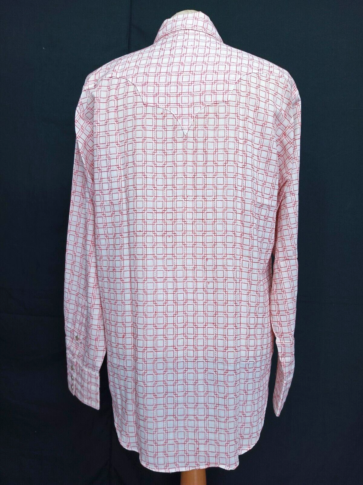 Awesome vintage 70's Rockmount Ranchwear pearl snap men's western shirt slim fitted authenticity guaranteed. Check out awesome vintage shirt long sleeves with snaps closure. The shirt has point collar, double flap chest snap pocket on front with 7 pearl snap buttons closure on front. The color is white, red with geometric woven on shirt. Fabric look like polyester/cotton. The shirt is pre-owned in excellent vintage condition no holes, rips, stains. It has been laundered clean and fresh ready to wear. Don't miss out cool and awesome vintage western shirt.