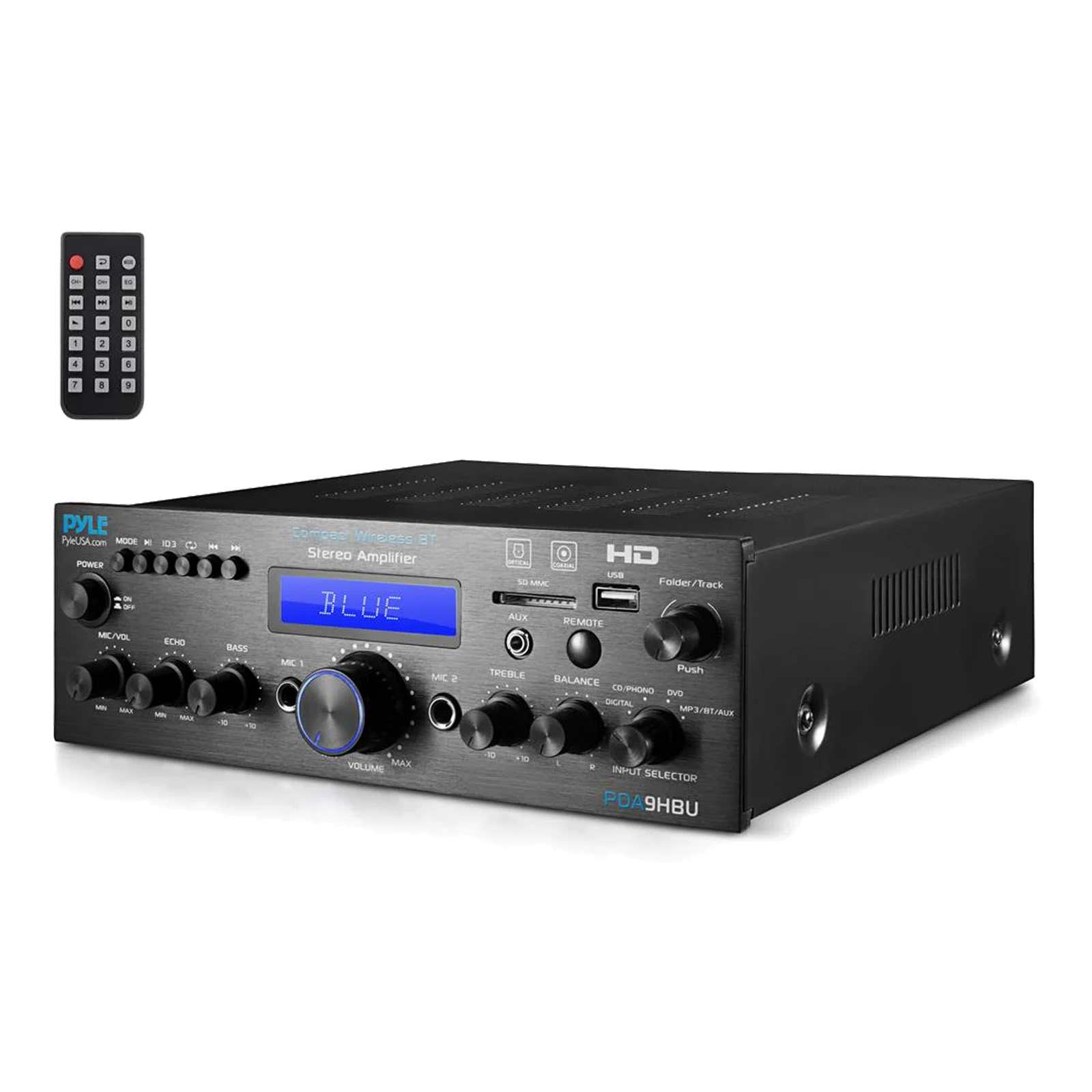 Pyle PDA9HBU 200 Watt Compact Wireless Bluetooth USB FM Radio Stereo Amplifier with Digital LCD Display Pyle - PDA9HBU This Pyle PDA9HBU Compact Wireless Bluetooth Stereo Amplifier gives your sound system an impressive boost. It offers accurate audio reproduction allowing you to enjoy high quality amplified audio. This pro audio system has FM radio and USB Flash Drive & SD Memory Card Readers for additional media expandability options. Bluetooth capability for wireless streaming! General Features: Bluetooth Connectivity: What’s In The Box: Technical Specs: