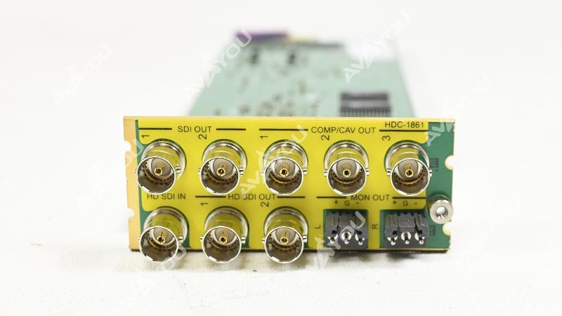 The HDC-1861 is an HD monitoring downconverter as well as a distribution amplifier, with an analog monitoring output. The HDC series cards are dual rate for hybrid HD/SD facilities. The DA section provides up to 4 HD reclocled outputs, and the HD downconverter supports multiple formats of signals, such as 1080i, 720p, 23.98 psf. All Metadata (TC, CC) and audio (2 groups) are processed in HD and SD. When SD is set at the input, the card offers ARC functionality with five presets. The SDI output can add on screen display of Time Code, input format as well as graticules and markers.