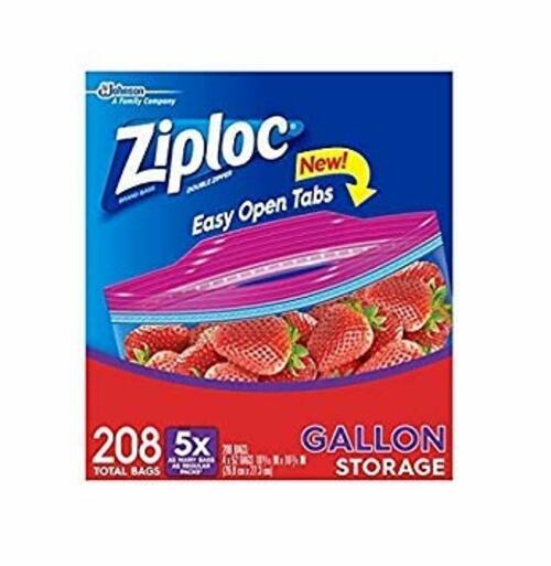 Ziploc Double Zipper Gallon Storage 208 Bags: economy 4 pack, 52 bags in each pack. Double zipper closure helps seal in freshness. Two zippers close easily together for a secure seal. The redesigned top make it easy to grasp and open