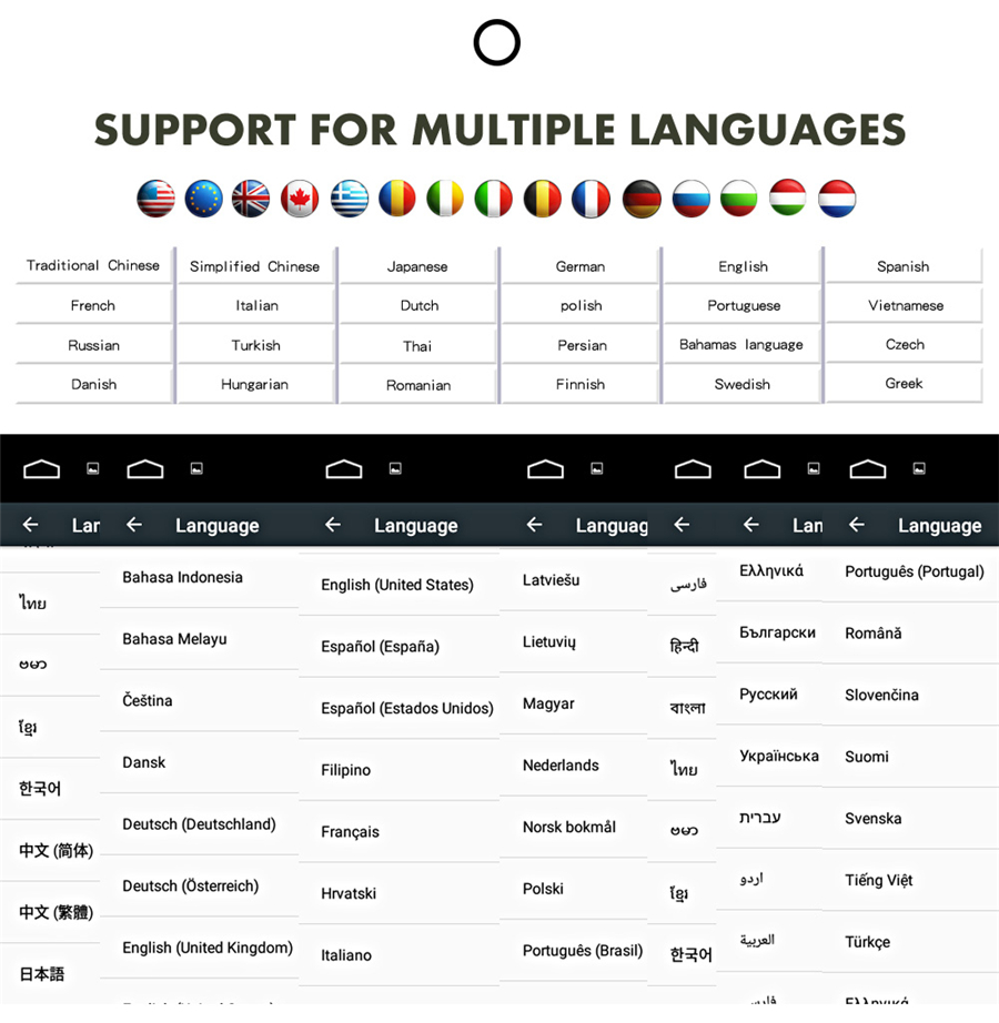 Setup | - WiFi/Hotspot/Bluetooth: Yes - Brightness level adjustable: Yes - Wallpaper: Wallpapers/Live Wallpapers/Gallery - Sound: Key Tone & Volume - Storage: Display Internal Storage/Nand Flash/Connected Device Storage - Apps: Running Apps display/force stop/uninstall - Security: Yes - Accounts: Yes - Languages and Input: more than 70 Languages and choose input method - Backup and Reset: Yes - Date and Time: Setting Date&Time by yourself or choose GPS/network-provided time - Accessibility: Yes - GPS: Yes, GPS application options/monitoring/sound mode/mixing ratio - Driving safety: Watching Video, Reversing X-mirror/Volume, Reversing Trajectory/radar Display, Rear view ruler - Amplifier: Rock/Pop/Jazz/Classic/Flat/Voice/Custom - Steering Wheel Control: Yes - About Device: Display Parameter Info. |