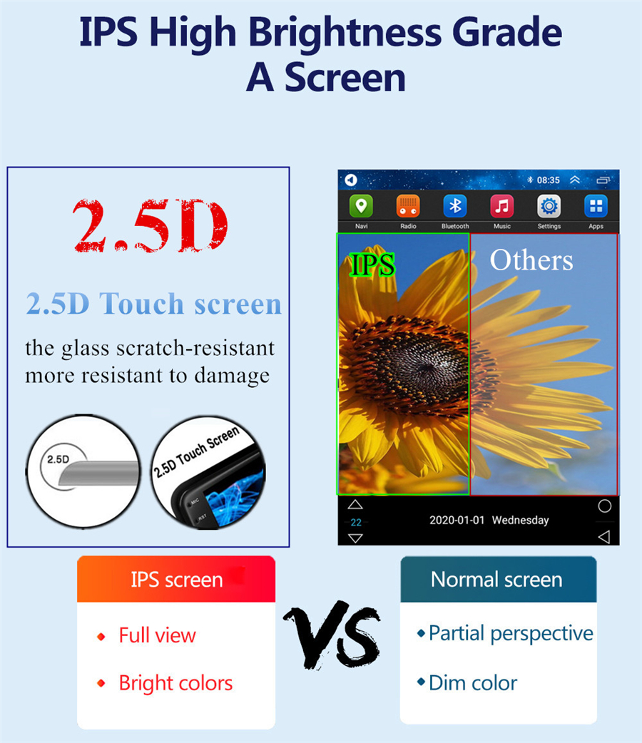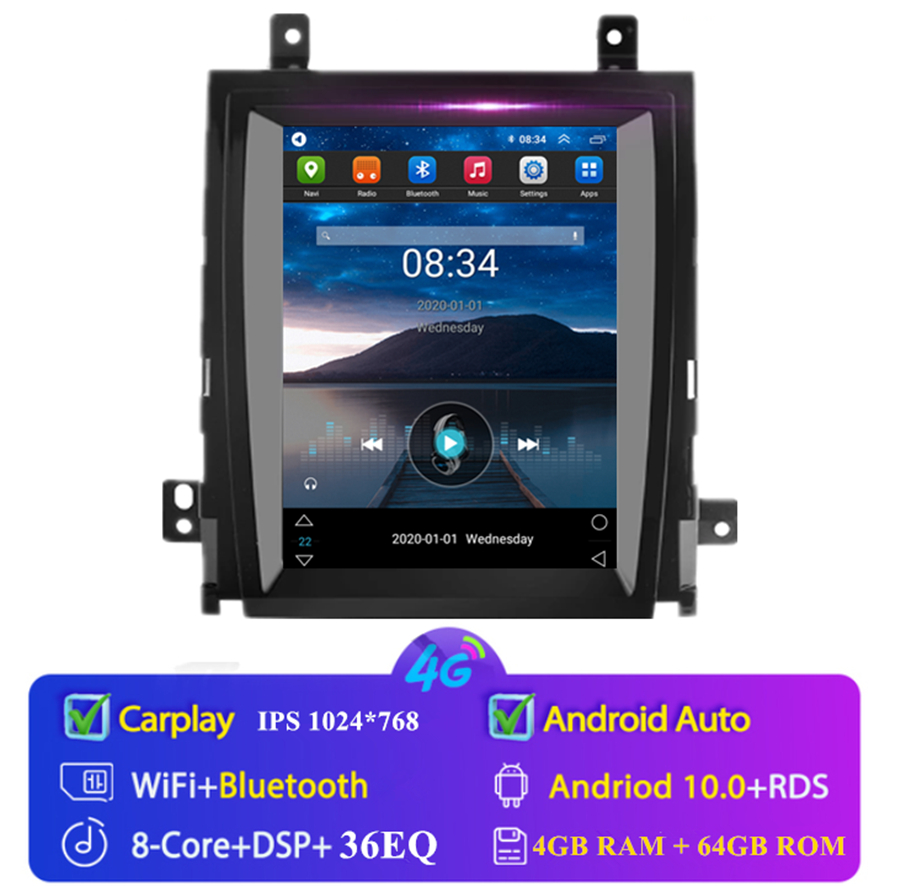 Display | - Touch Screen: Yes - Resolution: 1024*768 - Screen: IPS - Built-in Clock and Calendar: Yes, show real time and can use network-provided time- Main Menu Status Bar display: Can be changed to Music/Radio/BT-Stereo Player and Clock/Date/Week - Change Apps-Icon Position: Yes - Picture in picture: Yes - Spilt Screen: Yes Split