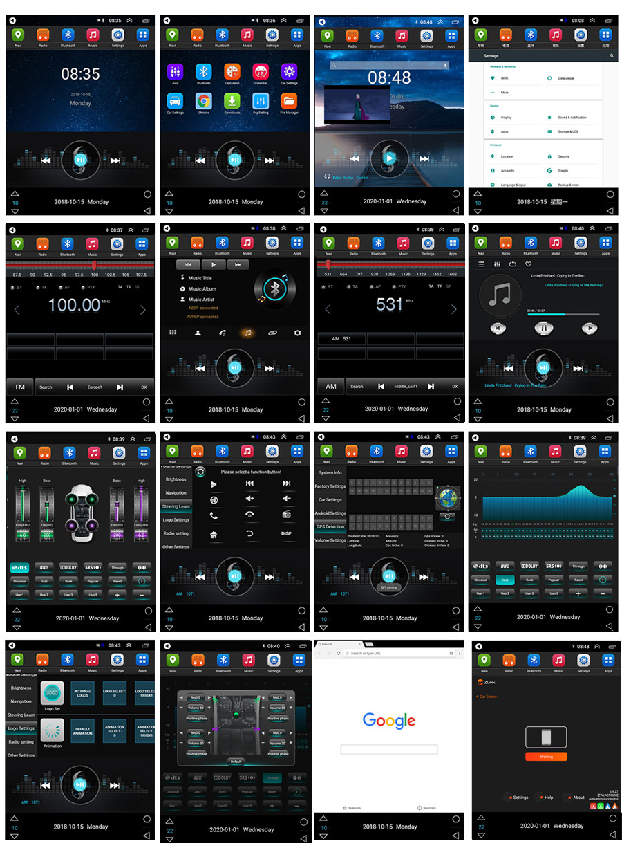 Setup | - WiFi/Hotspot/Bluetooth: Yes - Brightness level adjustable: Yes - Wallpaper: Wallpapers/Live Wallpapers/Gallery - Sound: Key Tone & Volume - Storage: Display Internal Storage/Nand Flash/Connected Device Storage - Apps: Running Apps display/force stop/uninstall - Security: Yes - Accounts: Yes - Languages and Input: more than 70 Languages and choose input method - Backup and Reset: Yes - Date and Time: Setting Date&Time by yourself or choose GPS/network-provided time - Accessibility: Yes - GPS: Yes, GPS application options/monitoring/sound mode/mixing ratio - Driving safety: Watching Video, Reversing X-mirror/Volume, Reversing Trajectory/radar Display, Rear view ruler - Amplifier: Rock/Pop/Jazz/Classic/Flat/Voice/Custom - Steering Wheel Control: Yes - About Device: Display Parameter Info. |