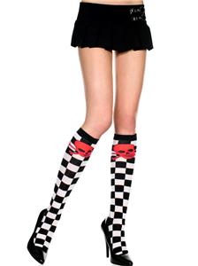 - Description: Opaque checkerboard print knee high stockings feature a red skull and crossbones design. Skirt not included.