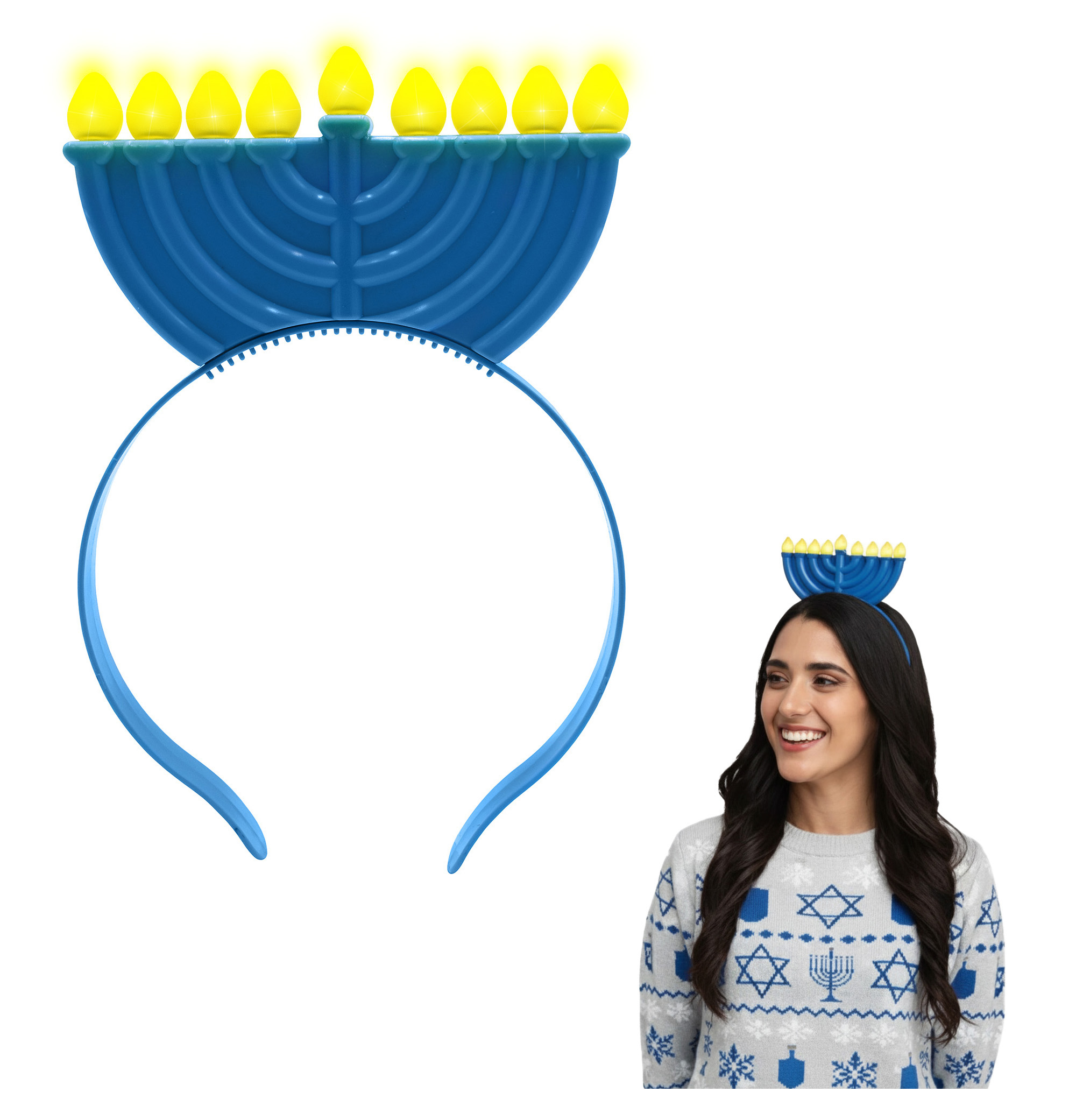 Whether you're lighting the menorah, spinning the dreidel, or joining a festive gathering, this glowing menorah headband lets your holiday spirit shine—literally! Pair it with your favorite Hanukkah sweater or wear it solo for an instant conversation starter. Spot clean only. Batteries included. For ages 14+.