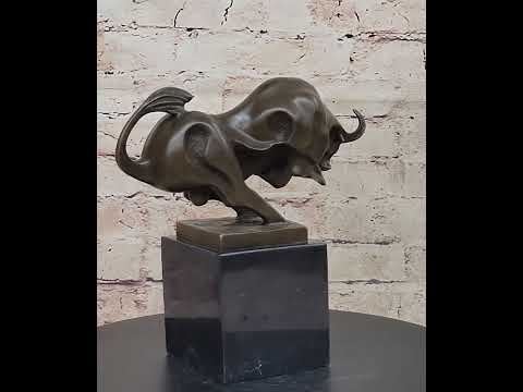 This captivating modern and abstract sculpture portrays the intense energy of a charging bull, captured in a moment of dynamic movement. With its head down, flared nostrils, and tightened muscles, the bull rears up, ready to stomp the ground and release a powerful grunt, asserting its presence. The sculpture vividly conveys the bull's heightened state of anger and determination, as it envisions a nemesis to charge and confront. The sharp and solid horns, along with the thick rolls of muscle around its neck, showcase the bull's physical prowess, emphasizing its readiness for confrontations of strength.