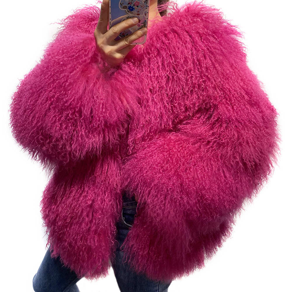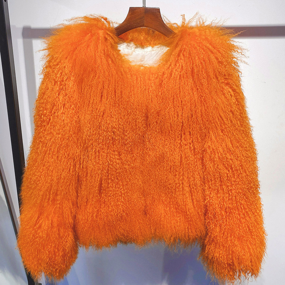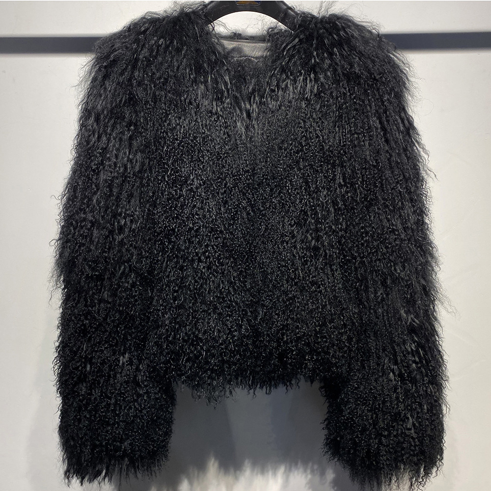 Women Cropped 100% Mongolian Fur Coat Solid Warm Luxury Fashion Winter Jacket