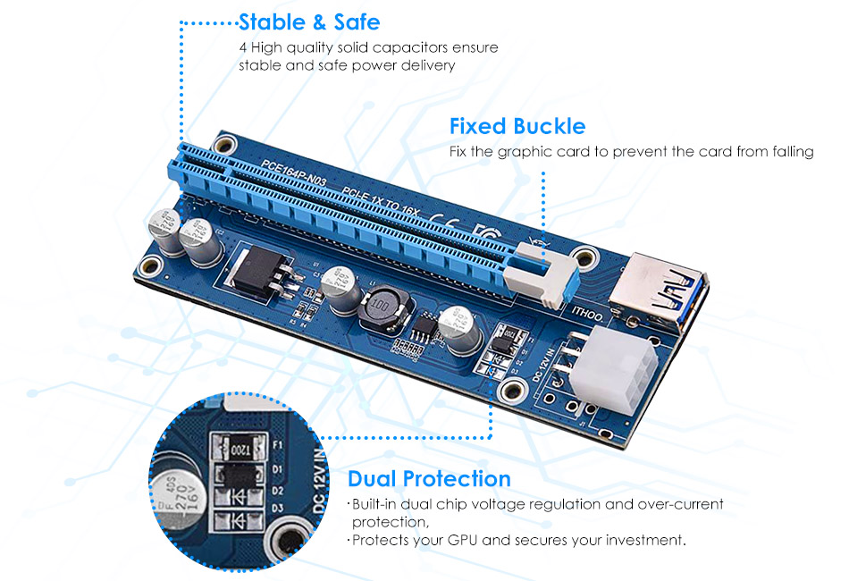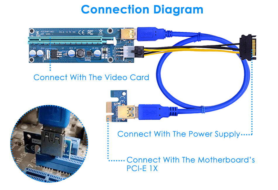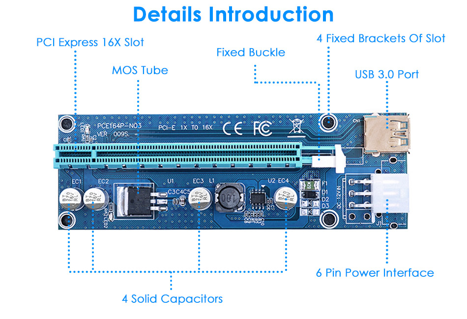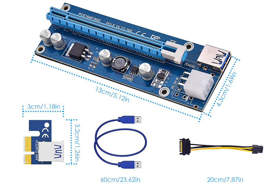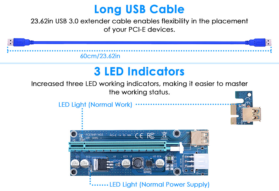 5 Sets PCI-E PCI Express Risers GPU Mining Powered Riser Adapter Card Product Detail Image GalleryProduct DescriptionOverview:The high performance PCI Express Riser is specially designed to safely and reliably convert PCI Express X1 slot from the mother board to external PCI Express X16 slot. Packed with 15Pin SATA to Molex 6Pin power cable, helps users easily get power for miner rigs GPUs, reduces the power burden on your motherboard and ensures maximum compatibility with your power supply. The USB 3.0 PCIE extension cable enables flexibility in the placement of your PCI-E devices and works in super speed. Features:- Long USB Cable & 3 LED Indicators:23.62in USB3.0 extender cable enables flexibility in the placement of your PCI-E devices. Increased 3 LED working indicators makes it easier to master the working status.