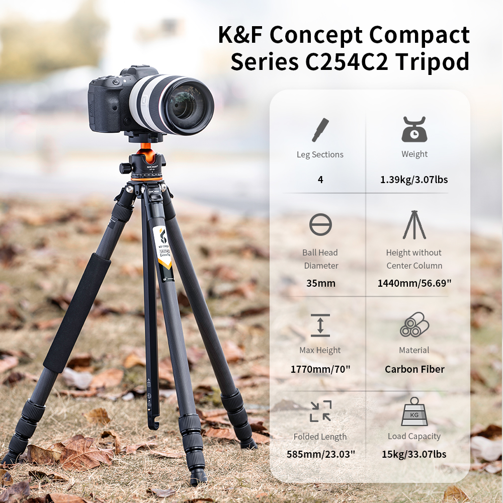 【Pro-Level Stability】To ensure the tripod with the same stability as a tripod without a center column, K&F Concept A254C4+BH-35L Carbon Fiber Tripod is designed with an embedded locking base so the tripod legs can be locked tightly and provide amazing pro-level stability.