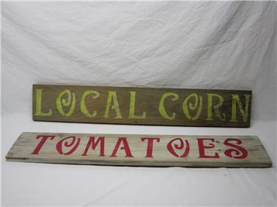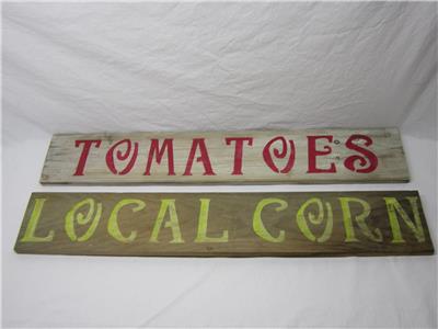 Great farmhouse decor roadside vegetable stand signs. Handmade on reclaimed wood by a little old lady here in Vermont. measure about 33 by 5 1/2 inches. These were made for inside decoration and not an old or antique item. Ready to hang. Display nicely. Matching egg sign listed separately. Sold as shown.