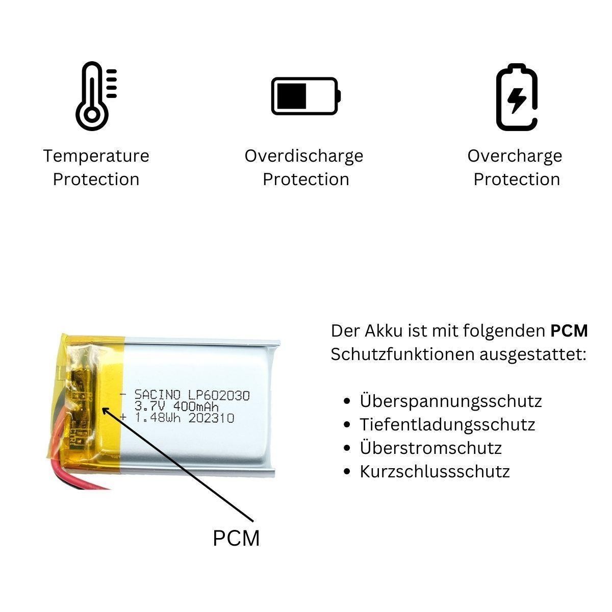 Spezifikationen LIPO Batterie 602030 3.7 Volt 400 mAh LIPO Batterie , wiederaufladbar -Nennleistung: 400 mAh . -1,48 Wh Anwendungsgebiete: Dieser vielseitige LIPO Akku ist für einen breiten Anwendungsbereich geeignet. Die LiPo-Zelle bietet hohe Leistung unter härtesten Bedingungen und bietet eine exellente Langlebigkeit. Hohe Sicherheit: Aufgrund des festen Elektrolyt und der Zellchemie gelten Li-Polymer-Zellen als sehr eigensicherr. Der Akkumulator besitzt ein flaches Spannungsprofil bei Ladung und Entladung. Der LiPo Akku zeichnet sich durch einen hohen elektrischen Wirkungsgrad aus. Laden Sie diese Zellen nur mit einem kompatibel miten LiPo-Ladegerät. Kein Memory Effek Produktbeschreibungen: -JST PH 1.25-2P Stecker - 3,7 V LIPO Batterie - Batteriekapazität (Nennwert des Herstellers): 400 mAh. - Batteriechemie: Lithium Polymer - Akkufunktion: Wiederaufladbar. - Akku-Formfaktor: INR 602030 - Nennspannung: 3,6 V. Marke:Efaso Länge: 30 mm Tiefe 6 mm Breite: 20 mm , Kabellänge 5 cm Mit Überspannungsschutz Geeignet u.a. für : Tragbare DVD-Player, drahtlose Bluetooth-Geräte, tragbare elektronische Geräte, PDA und Digitalkameras, GPS, Überwachungseinheiten, Notebook-Computer, E-Books, Telematik, Tracking-Geräte, Schlafmanagement-Geräte, Blutsauerstoff-Tracking-Geräte, Pulsmesser , Wi-Fi-fähige Smart-Home-Systeme. kompatibel mit für ür VXI BlueParrott B350-XT B450-XT B550-XT B350XT B450XT B550XT Bluetooth Headset. Passend für True Cam A7S