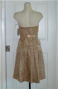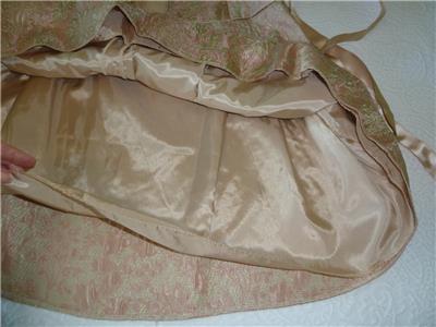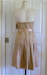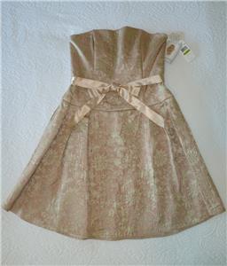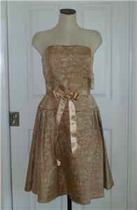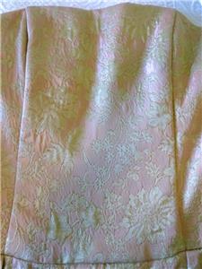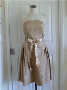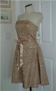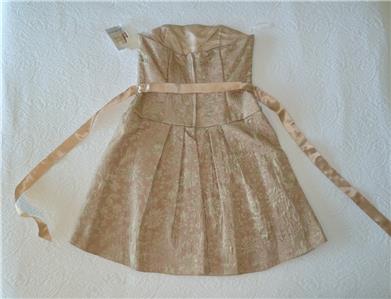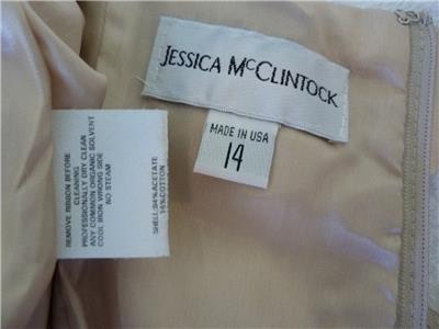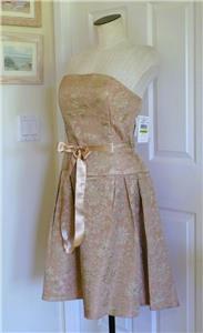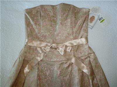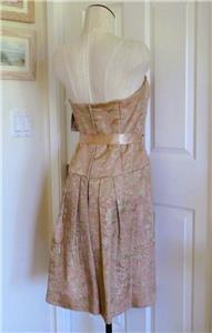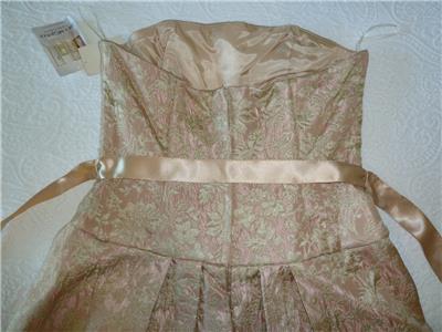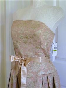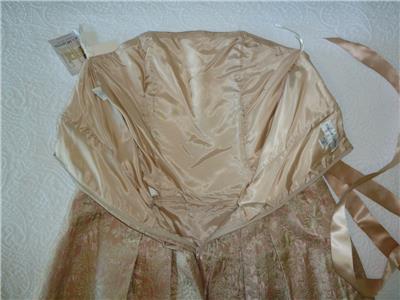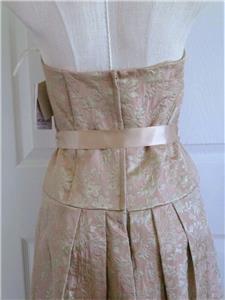 Sexy and stunning dress from JESSICA McCLINTOCK, with original tags, I believe from the 90s, possibly early 2000s. Tag size 14, measurements provided below. Gorgeous floral brocade in dusty pink rose and champagne, acetate and cotton; acetate lining, bodice separate from skirt. Strapless, corset bustier top with six bones, satin belt, hip level seam, pleated below, very figure flattering. Made in USA. Dry clean. Review all 21 photos to fully appreciate. New with tags, original 90s/2000s price $200.00.