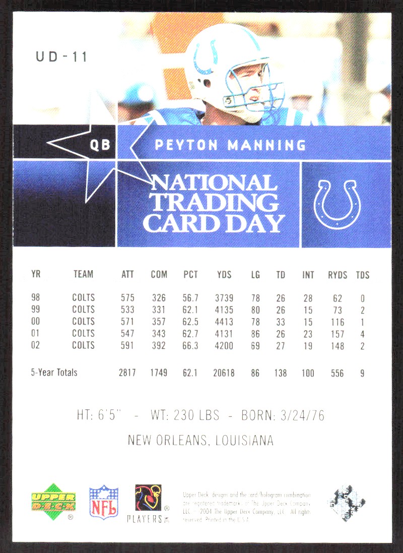 2004 1082A UPPER DECK TRADING CARD DAY Peyton Manning Indianapolis Colts #UD-11