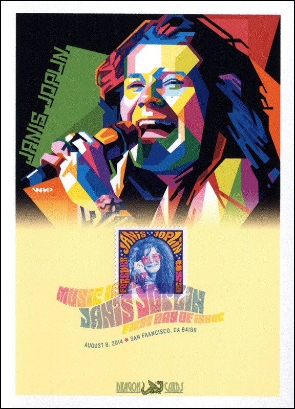 Sc. 4916 Janis Joplin on a 5"x7" Dragon Card featuring licensed original art by Gilar (Indonesian artist). Digital Color Postmark. Great addition for a music- or rock 'n roll-on-stamps collection!