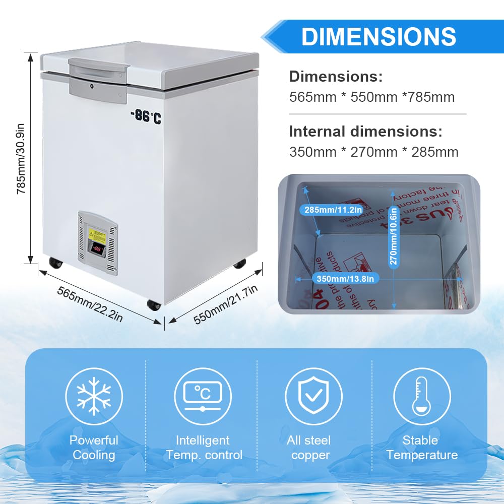 【ATTENTION】When the freezer is used, it should be cooled to the set temperature first, and then put in food or samples in batches;The condenser should be cleaned regularly (about 3 months) to maintain a good heat dissipation effect.