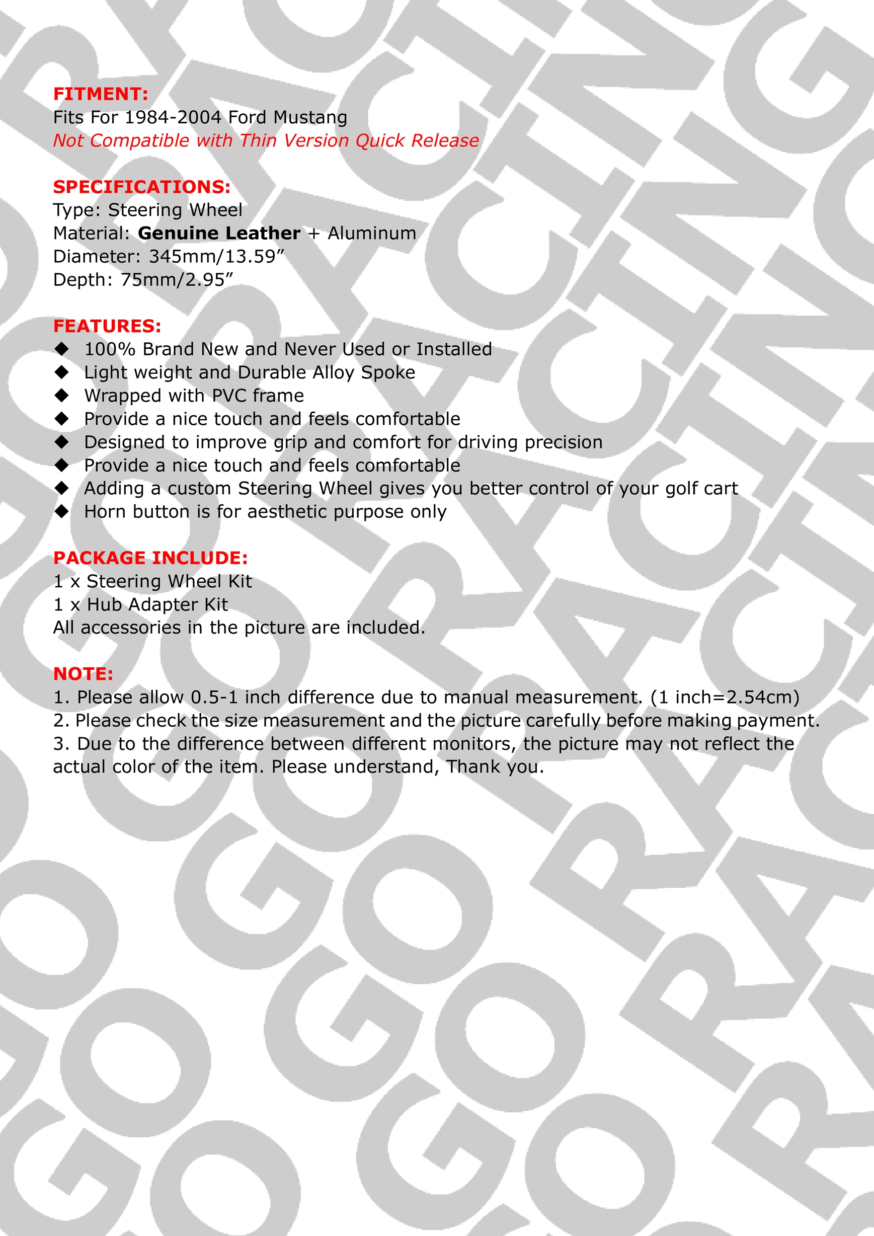 14" Genuine Leather Steering Wheel Quick Release Hub Adapter For Ford Mustang 84-04