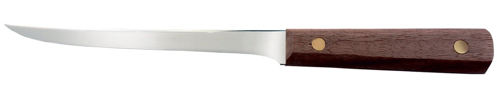 11" (27.94cm) overall. 6.5" (16.51cm) satin finish stainless fillet blade. Brown wood handle. Full tang. Brown leather belt sheath. Boxed.