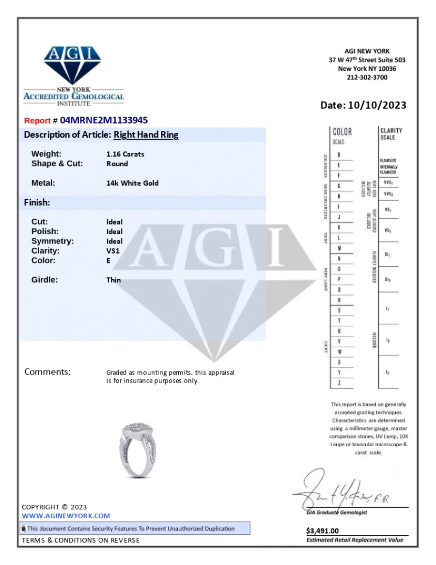 This breathtaking 1.16 carat total 14k white gold split shank anniversary ring with round brilliant cut diamonds certified by AGI Gemological Laboratories as Natural Earth Mined Diamonds with E color, VS1 clarity and Ideal polish. To accentuate the glow of the diamond on this unique piece our jewelry designer chose pave setting. This item will come with a 3rd party certificate and an estimate appraisal value of $3,491.