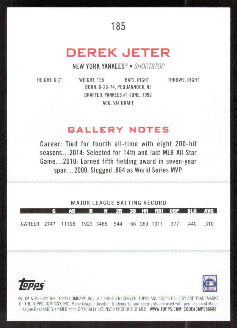2022 3166A TOPPS GALLERY DEREK JETER New York Yankees #185