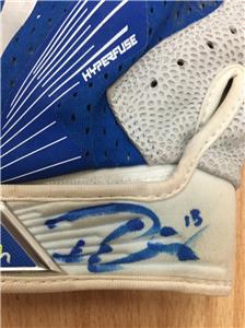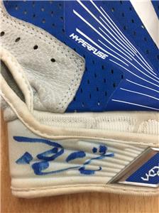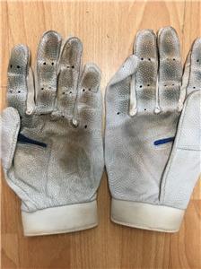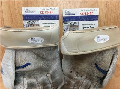 GAME-USED WHITE & BLUE NIKE BATTING GLOVES. JSA CERTIFIED WITH COA SD22491-92. BLUE INK AUTOGRAPH.