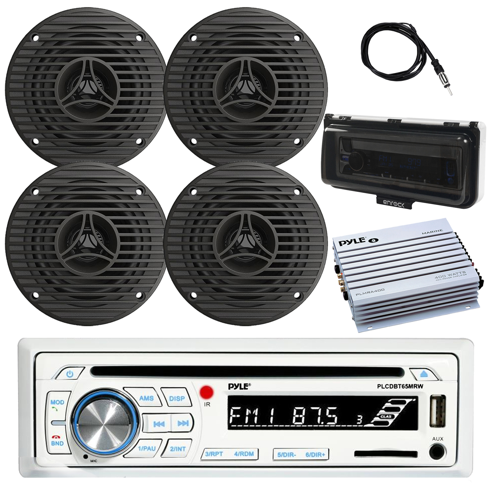 Pyle Bluetooth Marine AM/FM CD Stereo Receiver (White) with 3.5" 75W Peak High Performance Full Range All Weather Graphite Grey Speakers (QTY 4), 4-Channel 400W Amplifier, Radio Cover (White), Antenna