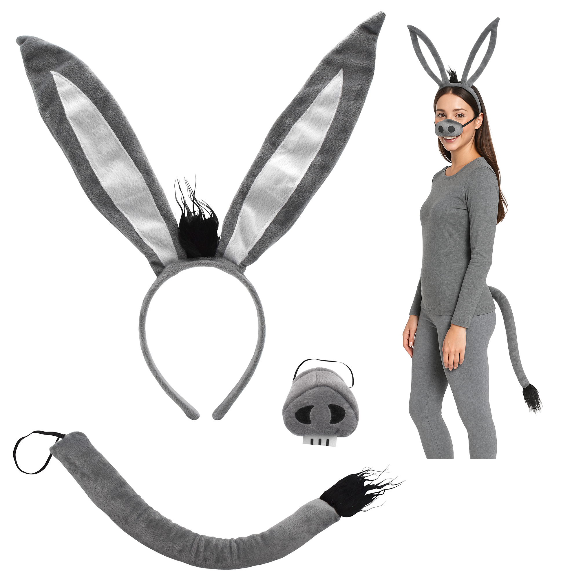 - Complete Animal Cosplay Kit: This adult gray donkey costume set includes everything needed to complete your character look—an oversized plush headband with bendable ears, a soft fabric nose with an elastic strap, and a bendable tail with a loop for easy wear. Whether you’re gearing up for Halloween, a themed party, or a school play, this full set instantly transforms any outfit into a charming farm animal costume.