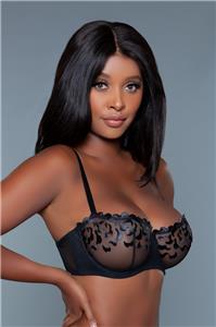 - Description: Unlined balconette bra features an embroidered mesh frame design, fully adjustable straps and hook and eye closure. Bra has defects. Please see photos. ALL SALES FINAL.