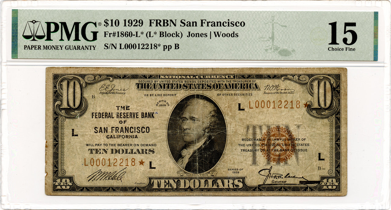 1929 $10 San Francisco, CA Federal Reserve Bank Star Note Fr. #1860-L* (L* Block) Jones & Woods S/N #L00012218* pp B PMG Choice Fine 15. The note shows folds, creases, and minor rust stains.