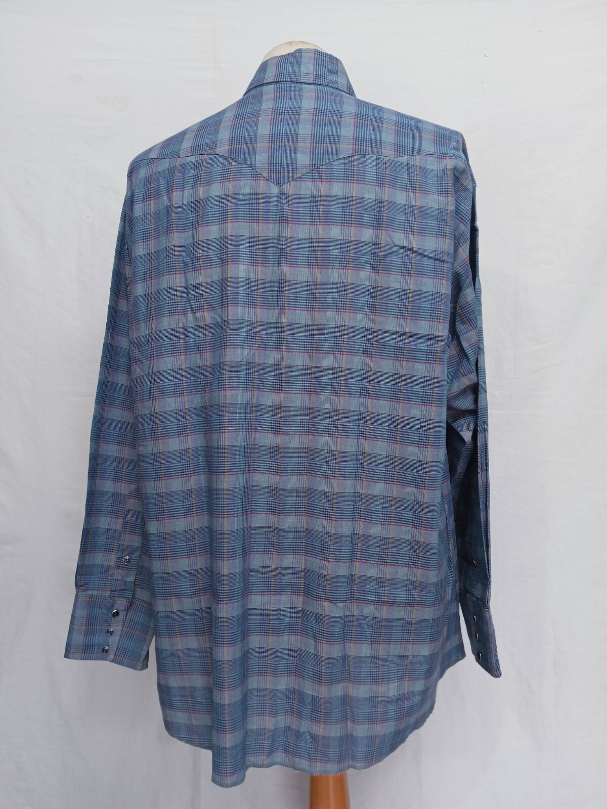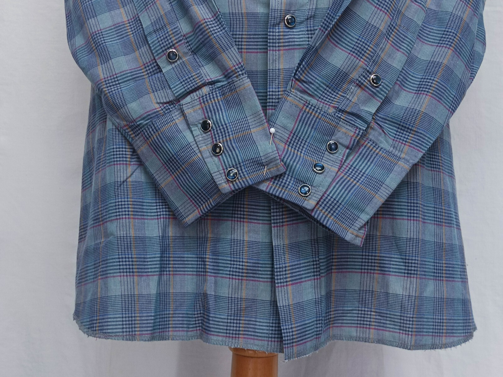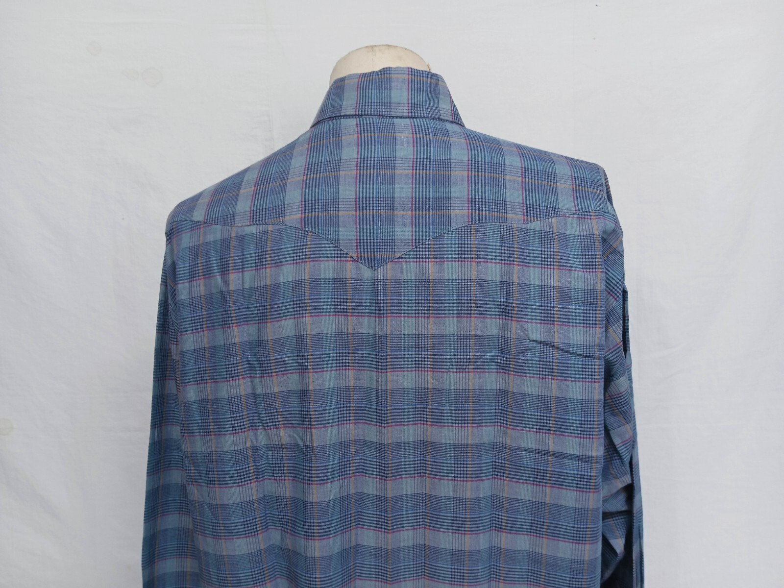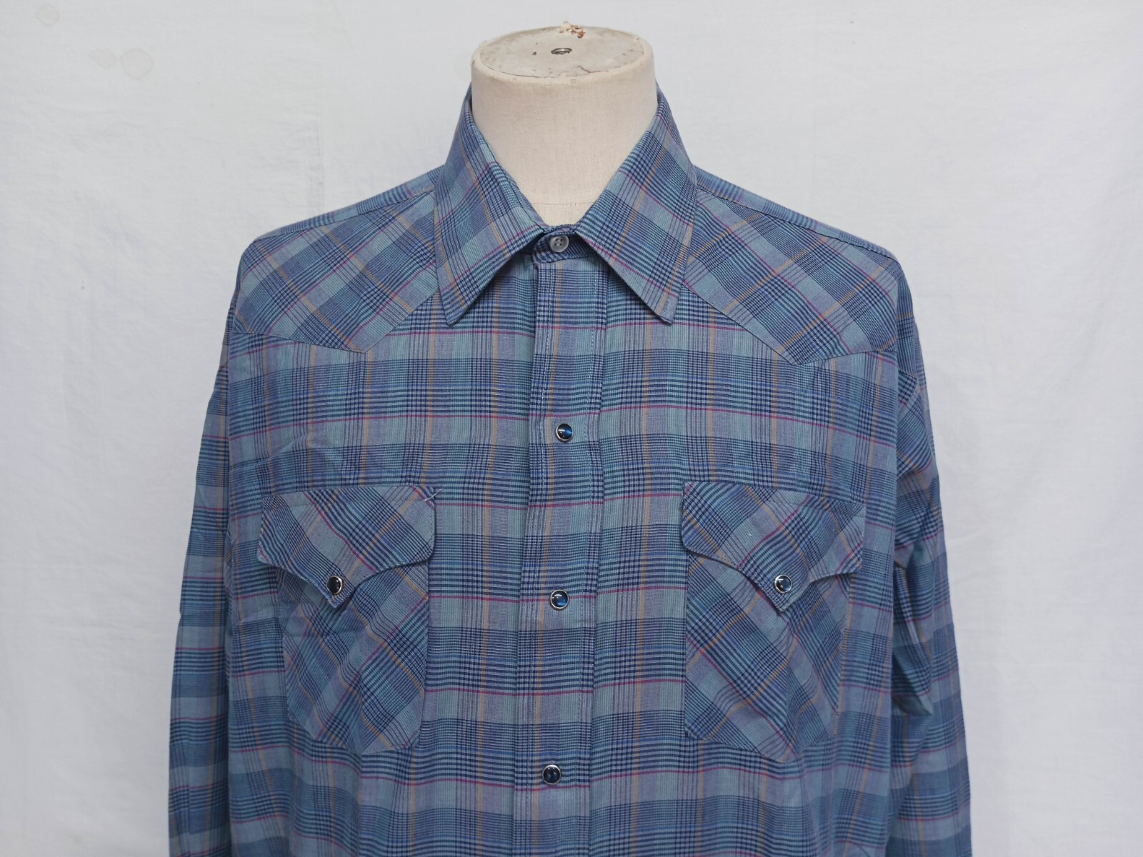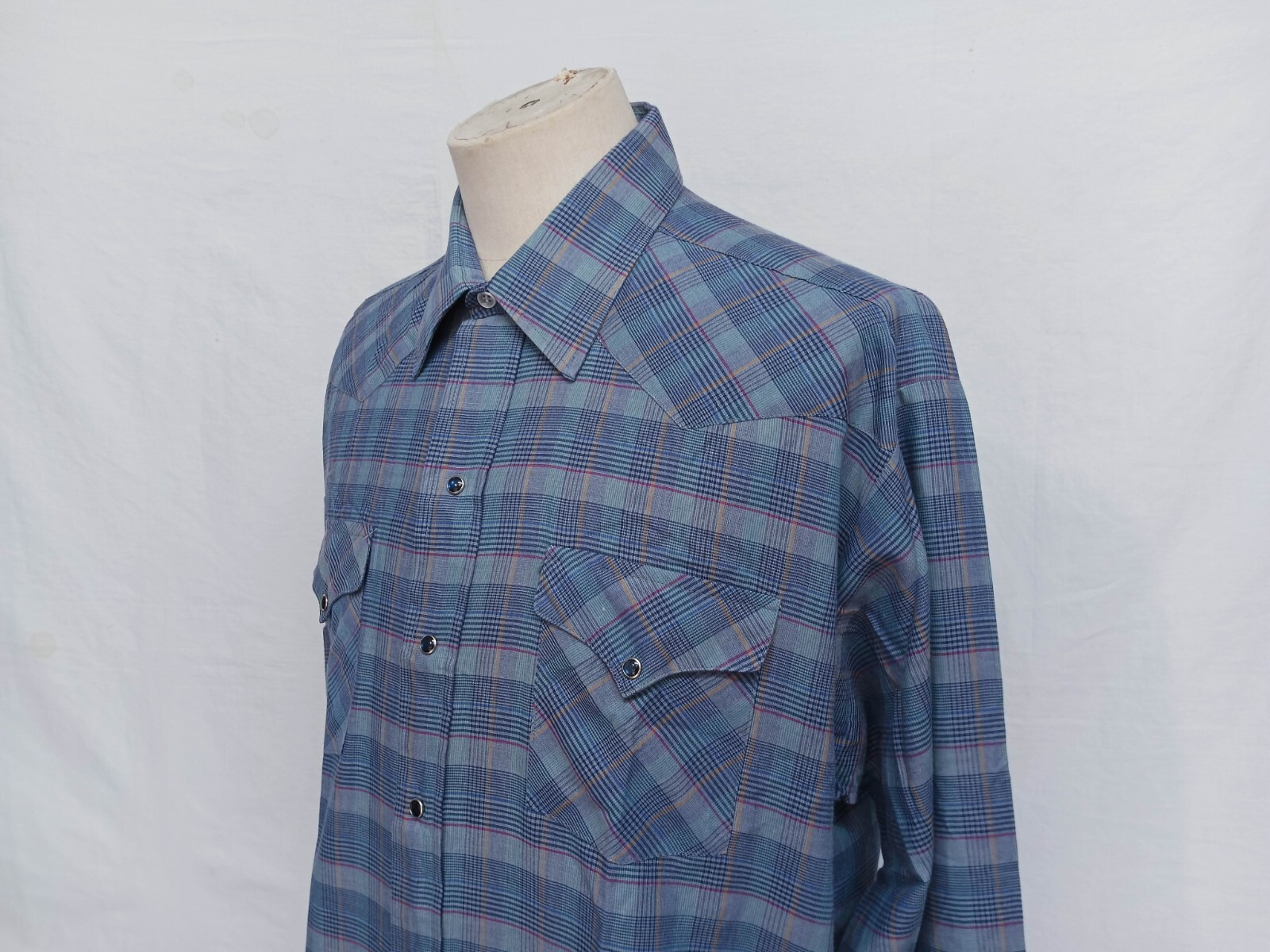 Awesome vintage Panhandle Slim pearl snap blue plaid men's western shirt authenticity guaranteed. Check out awesome vintage shirt long sleeves with snaps closure. The shirt has point collar, double flap chest snap pocket on front with 7 pearl snap buttons closure on front. The color is shades of blue, yellow, purple with plaid pattern. Fabric is 65% polyester, 35% cotton. The shirt is pre-owned in good vintage condition no holes, rips, stains. It has been laundered clean and fresh ready to wear. Don't miss out cool and awesome vintage western shirt.