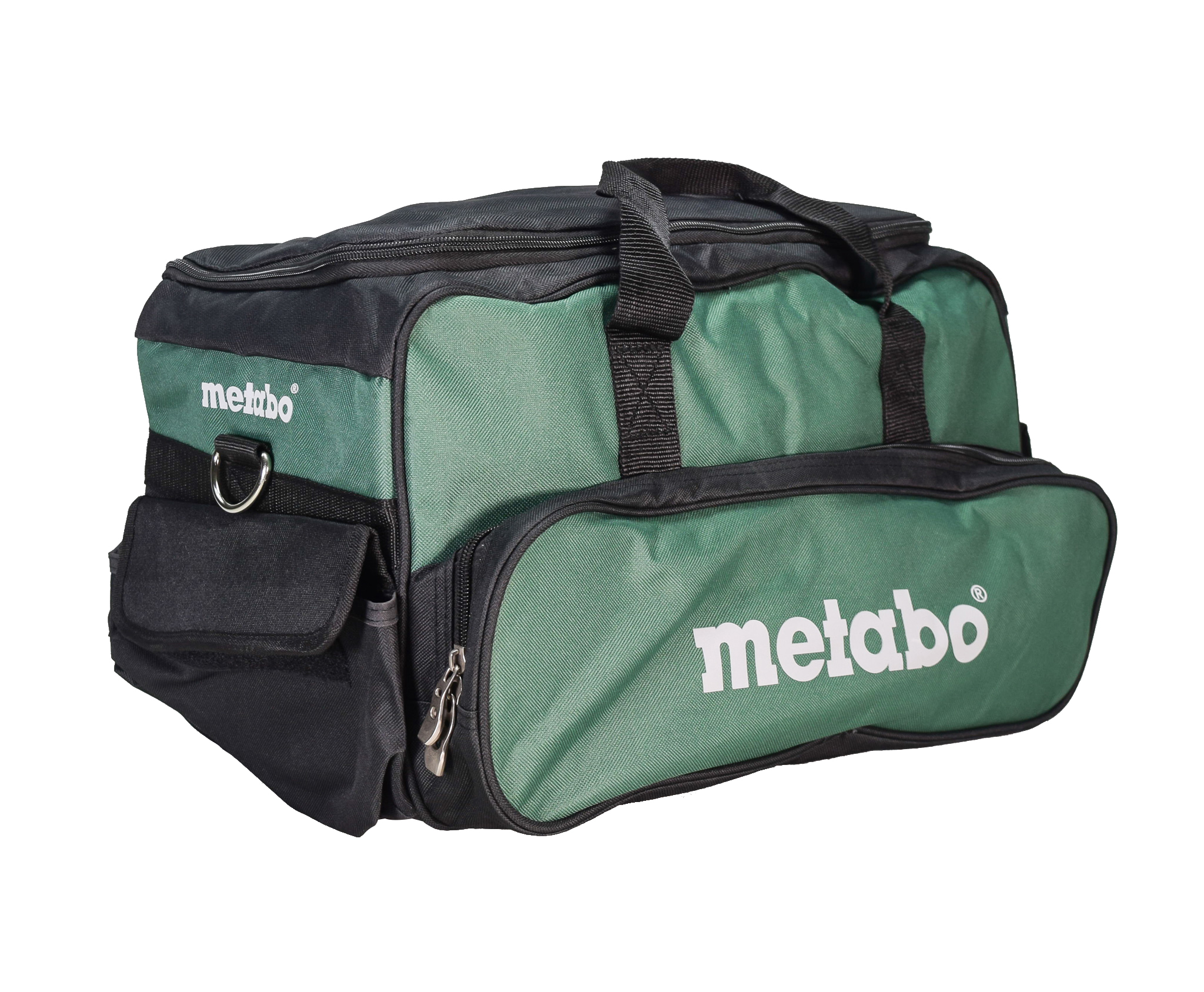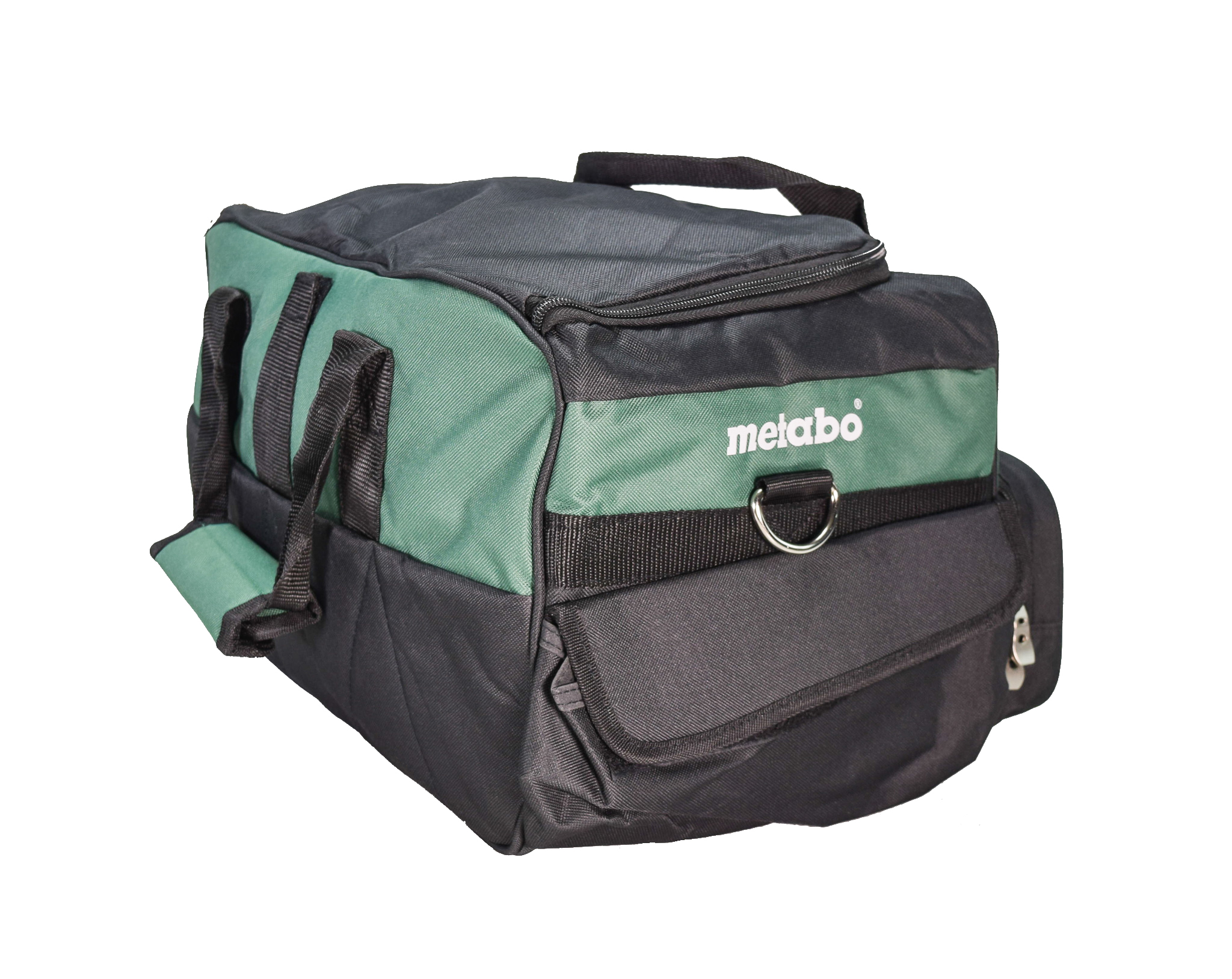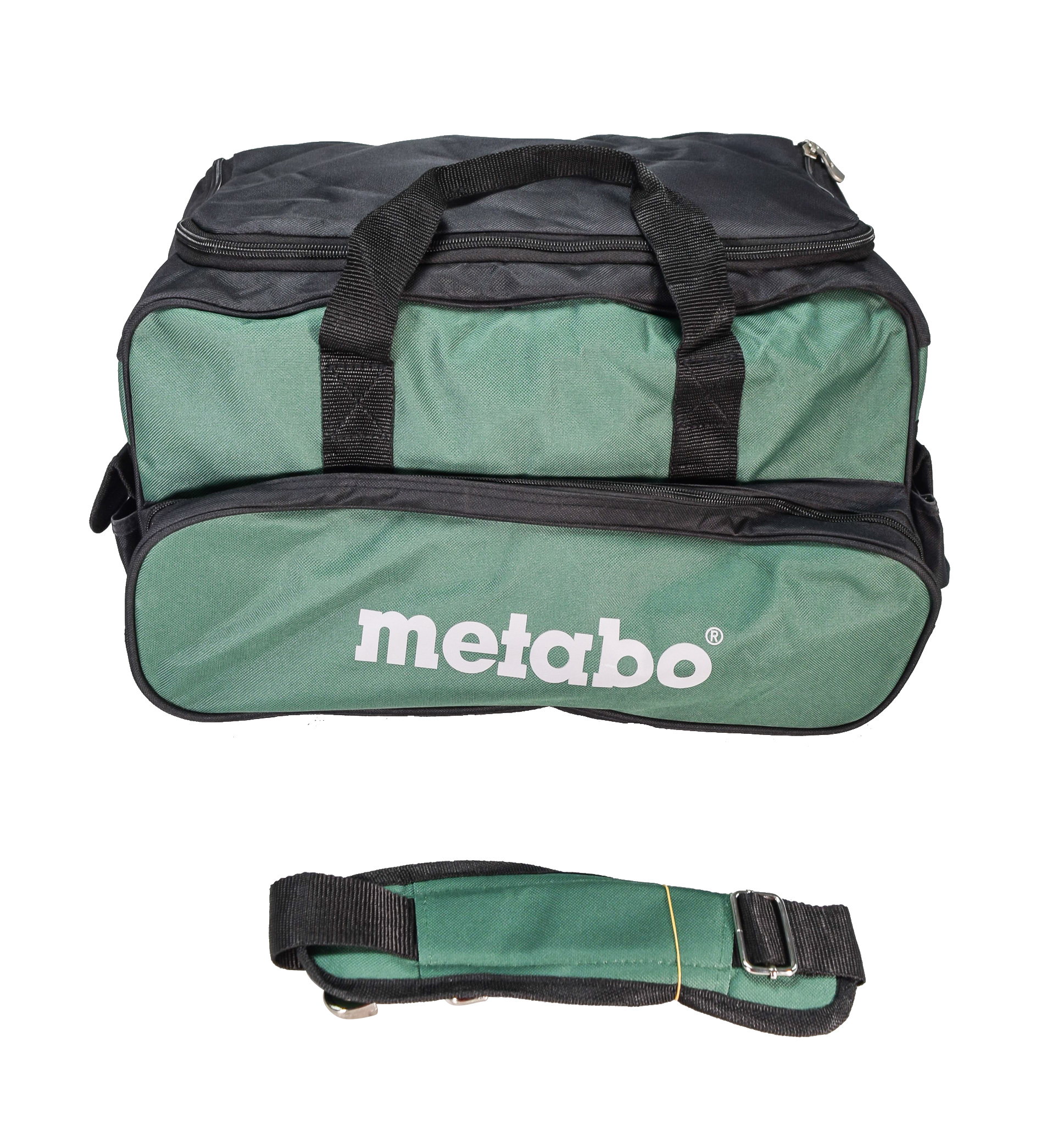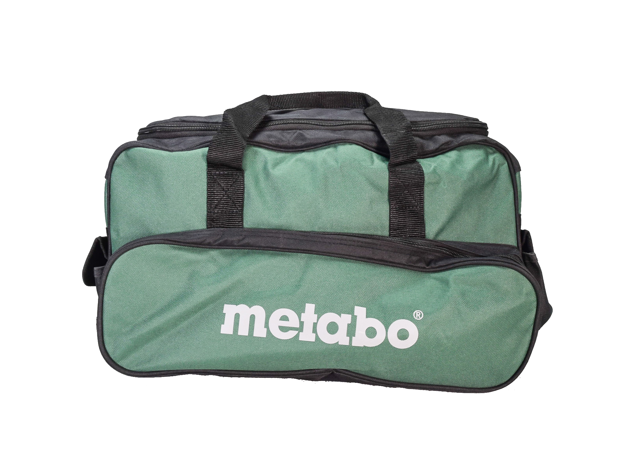 The robust and compact Metabo tool bag. On the inside of the bag there are three bag compartments with hook and loop straps to take two battery packs and one charger.
