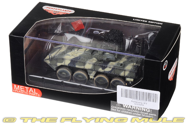 The VPK-7829 Bumerang is a modular amphibious wheeled infantry fighting vehicle and armored personnel carrier being developed by Russian Military Industrial Company (MIC) for the Russian army. MIC claims it "will be nothing like any of the modern APCs." The Bumerang vehicle will be based on Armata Universal Combat Platform. It will be amphibious and be able to negotiate and overcome water obstacles using two waterjets. In a departure with the previous BTR (Like BTR-70) series of vehicles, the engine will be located in the front instead of the rear. MIC VPK-7829 Bumerang IFVDesigned as an amphibious 8-wheeled armored fighting vehicle to replace the BTR-80, the Bumerang is a modular wheeled Infantry Fighting Vehicle and Armored Personnel Carrier.© Copyright 2003-2026 The Flying Mule, Inc. Panzerkampf 1:72 ArmorThe Panzerkampf "1:72 Armor" range presents affordable, ready made diecast models of military vehicles in 1:72 scale.Panzerkampf diecast vehicles feature: