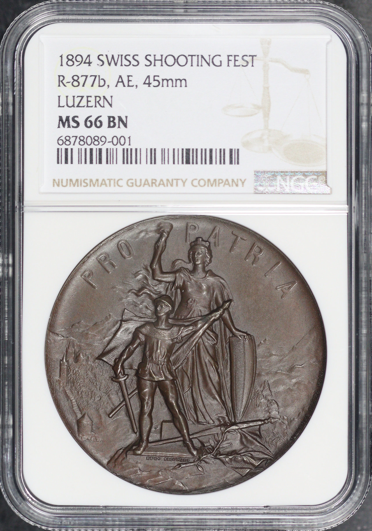 1894 Swiss Shooting Fest Luzern 45mm Bronze Medal R-877b NGC MS-66 BN. There are some minor scuffs on the NGC holder.