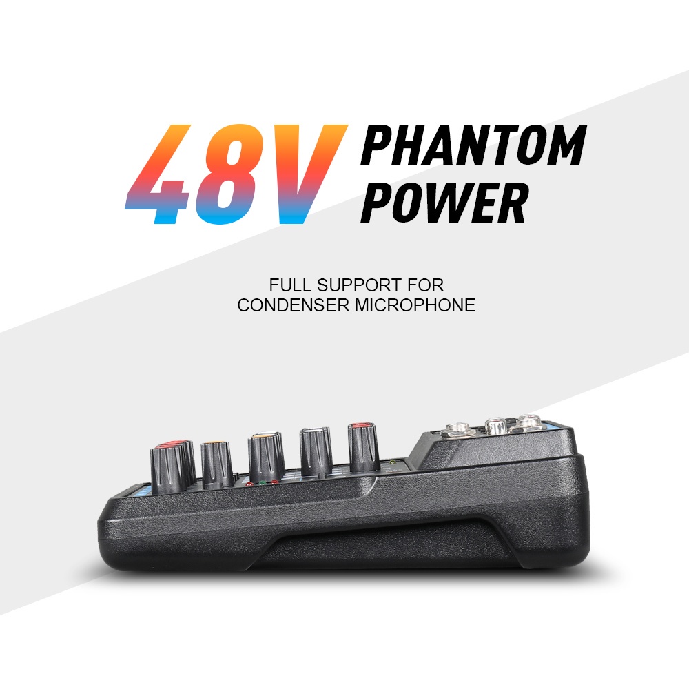 The mixer is equipped with input gain and high bass adjustment, built-in 48V phantom power supply for condenser microphone direct power supply, high-definition headset output port, MP3, WMA, WAV, FLAC broadcast, device with a sound card can be directly connected to the PC.