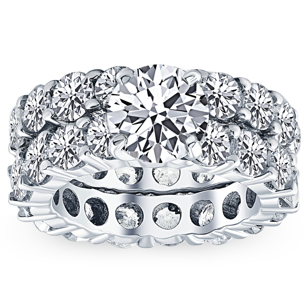 Womens ring features a 1 1/2ct round brilliant cut lab grown diamond and two four carat eternity rings. All diamonds are set in solid 14k white gold. Matching eternity wedding ring is included.