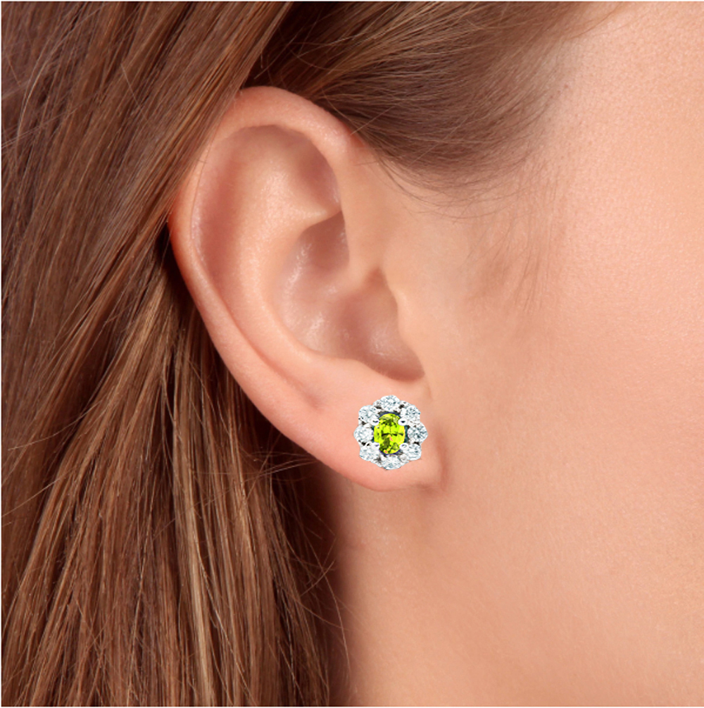 This matching pair of women's earrings features two oval brilliant citrine gemstones and 16 round brilliant cut natural diamonds. All diamonds are set in solid 14K white gold with 14k white gold heavy weight push backs.