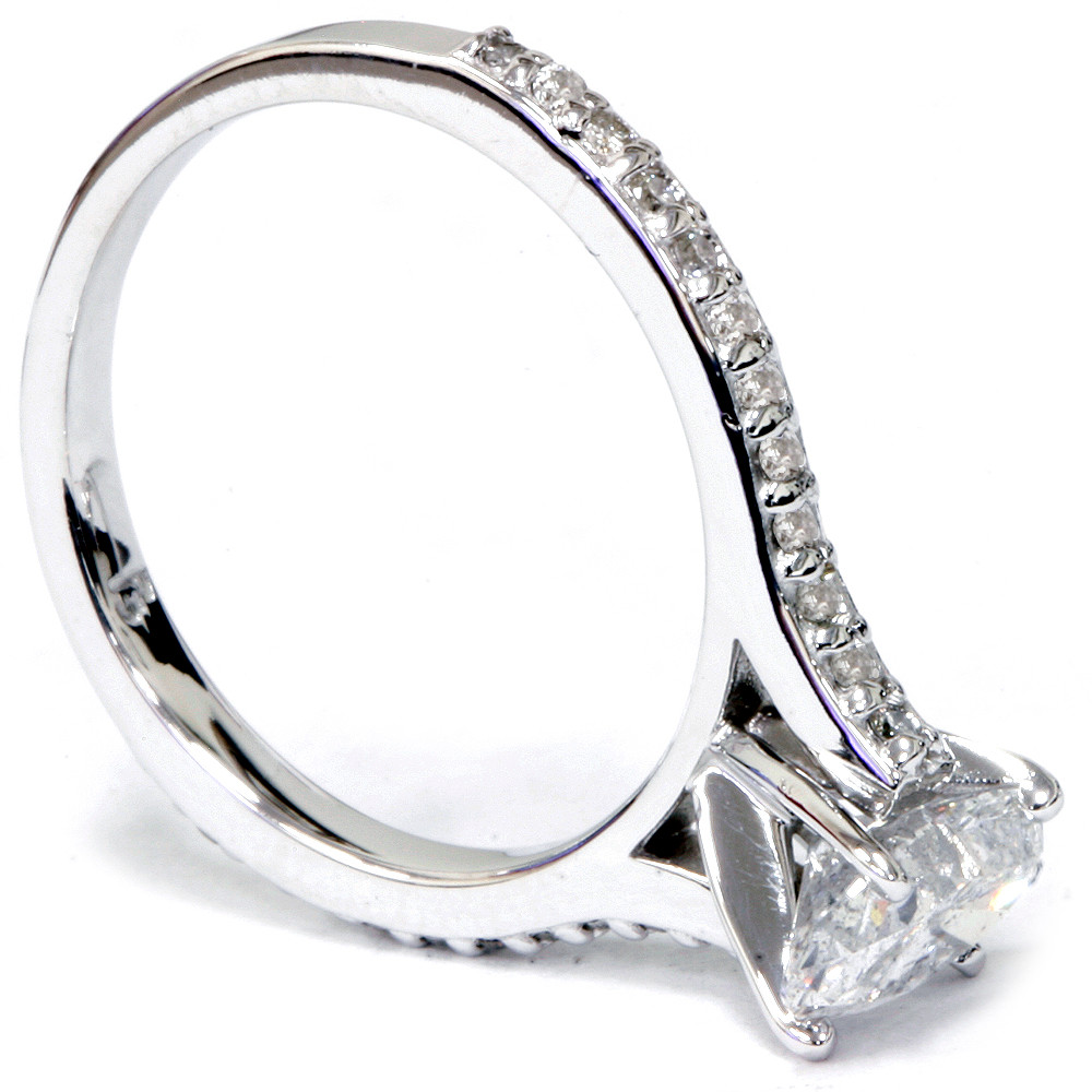 Womens ring features one oval cut diamond and 24 round cut diamonds. All diamonds are set in solid 14k white gold.