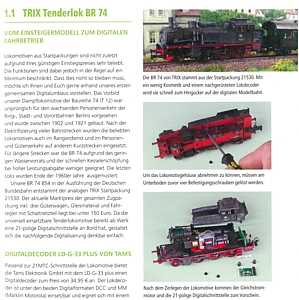 Die Gliederung des Inhalts: - Vorwort - Kapitel 1: DAMPFLOKOMOTIVEN - Spannende Digitalprojekte mit Pfiff und Dampf --- 1.1 TRIX-Tenderlok BR 74: Vom Einsteigermodell zum digitalen Fahrbetrieb --- 1.2 Liliput BR 84: Decoderupgrade mit 21 MTC-Digitalschnittstelle ab Werk --- 1.3 Märklin BR 85: Vom betagten DELTA-Modell zum digitalen Hingucker --- 1.4 Märklin BR 003: Sound, Rauch und mehr für einen Modellbahnklassiker - Kapitel 2: DIESELLOKOMOTIVEN - Nostalgisch, modern und natürlich wieder digital --- 2.1 Liliput Henschel BBC DE 2500: „Roter Ochse" mit 21MTC-Schnittstelle --- 2.2 Roco V 160: Motor- und Betriebsgeräusche wie beim großen Vorbild --- 2.3 Märklin V 36 110: Fahrspaß mit Energiespeicher und Motorupgrade --- 2.4 Märklin 290 022-3: Passgenauer Ersatz für den C-Sinus-Softdrive-Motor - Kapitel 3: ELEKTROLOKOMOTIVEN - Digitaler Modellbahnbetrieb ohne Diesel und Kohle --- 3.1 Roco BR 193 „Ruhrpiercer": Digitalupgrade mit Mittelleiterumbau --- 3.2 Piko BR 147.5: DB-Fernverkehr mit Loksound und Energiespeicher --- 3.3 Märklin BR 120: Digitale Hochleistungen mit Werkskomponenten --- 3.4 Märklin BR 151: Mit Glockenankermotor und Lichtleitern zum Hingucker - Kapitel 4: TRIEBWAGEN UND WENDEZÜGE - Digitaler Fahrbetrieb mit Schienenzeppelin, VT 11.5 und Co. --- 4.1 Technische Besonderheiten und Fallstricke beim digitalen Wendezugbetrieb --- 4.2 Märklin Schienenzeppelin: Vom betagten Einzelstück zum echten Hingucker --- 4.3 Roco VT 11.5: Paradezug der DB mit Originalsound und Zusatzfunktionen --- 4.4 Märklin BR 111 und Piko x-Wagen: Wendezugbetrieb mit Steuerwagen - Kapitel 5: GLEISANLAGEN IM DIGITALBETRIEB - Digitale Zugbeeinflussung auf der Modelleisenbahn --- 5.1 Hintergründe: Brems- und Halteabschnitte auf der digitalen Modellbahn --- 5.2 Die Märklin-Bremsstrecke: Zielgenaues Anhalten mit Gleichspannung --- 5.3 Bremsmodul Oneway: Fahrtrichtungsabhängiges Bremsen mit Mittelleiter --- 5.4 ABC-Bremsverfahren: Brems- und Langsamfahrabschnitte in der Praxis - Kapitel 6: FUNKTIONSMODELLE - Mit Licht und Bewegung tolle Hingucker schaffen --- 6.1 Uhlenbrocks Firmensitz: Lasercut-Bausatz mit digitaler LED-Beleuchtung --- 6.2 Wohnhaus von Auhagen: Einzelfensterbeleuchtung mit Datenbus-LEDs --- 6.3 Vollmer-Lokschuppen: Funktionsfähige Tore mit Servos und Schaltdecoder --- 6.4 Kibri-Wartungshalle: Upgrade mit elektrischen Rolltoren und Lichteffekten |