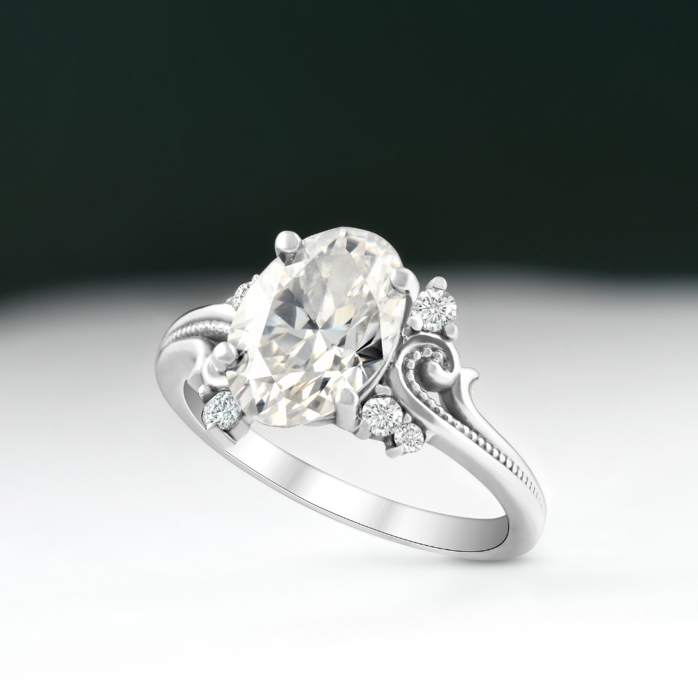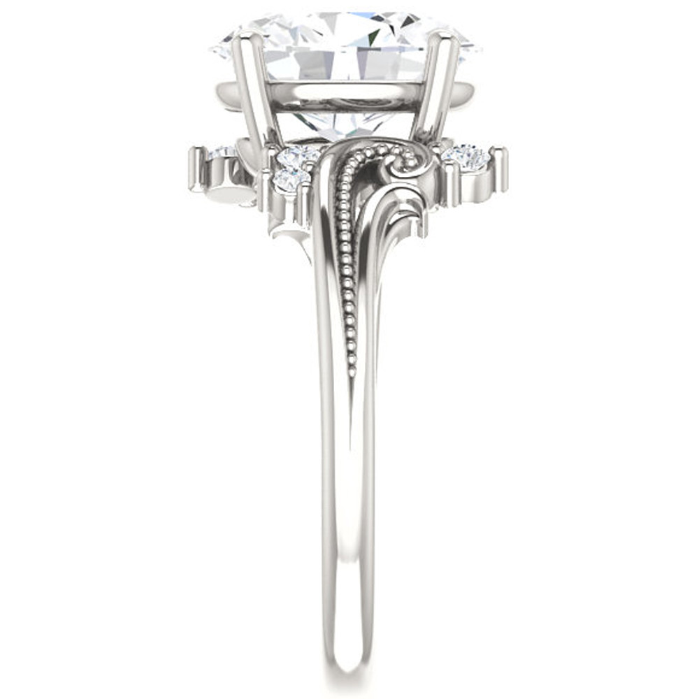 Womens ring features a 7 x 10mm oval moissanite and six round cut lab grown diamonds. All stones are set in solid 14k white gold high polished mounting. The unique engagement ring features artistic detail that you would not find in every other type of ring. This ring is very sparkly and something you will love to wear forever.