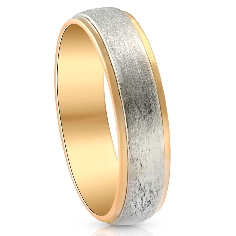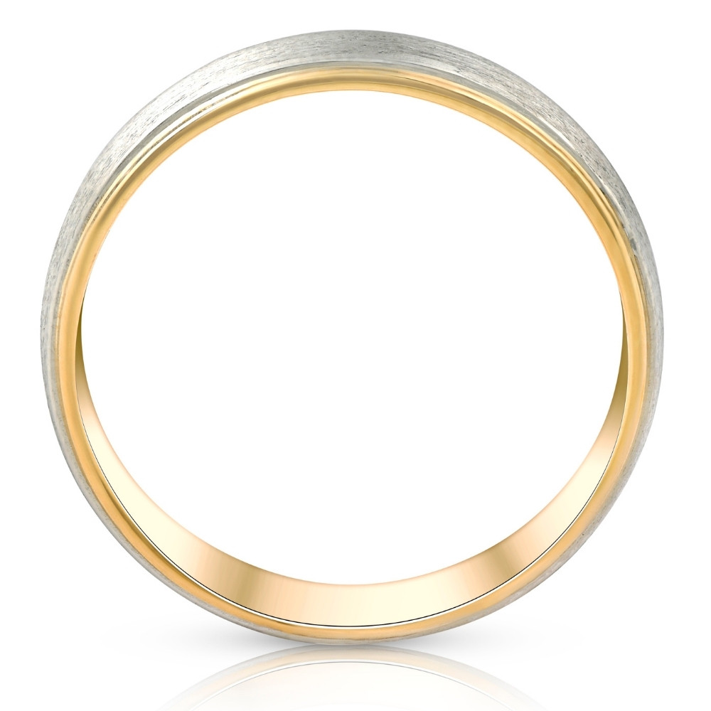 Classic mens wedding band measures 6mm wide and features a brushed center. The ring is made of solid platinum and 14k yellow gold and has a beveled inside edge for comfortable wear.