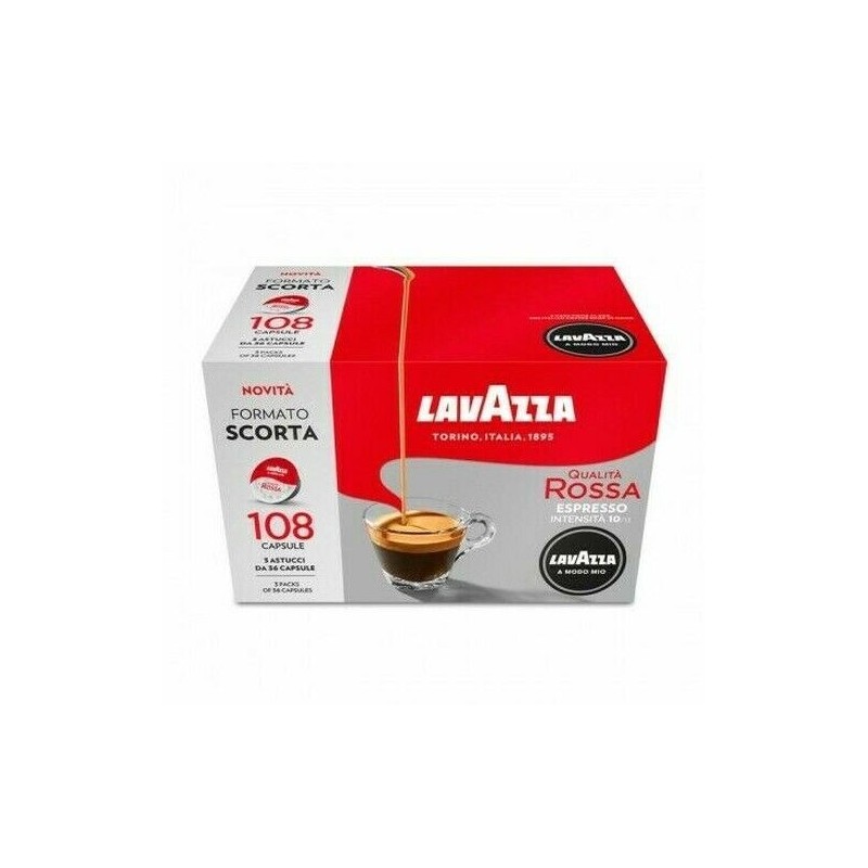 Lavazza A Modo Mio Qualità Rossa, 108 Capsule. Tipo di prodotto: Capsule caffè, Tipologie di bevande: Espresso, Livello di tostatura del caffè: Tostatura media. Larghezza imballo: 228 mm, Profondità imballo: 150 mm, Altezza imballo: 150 mm. Quantità per pacco: 108 pz. Paese di origine: Italia